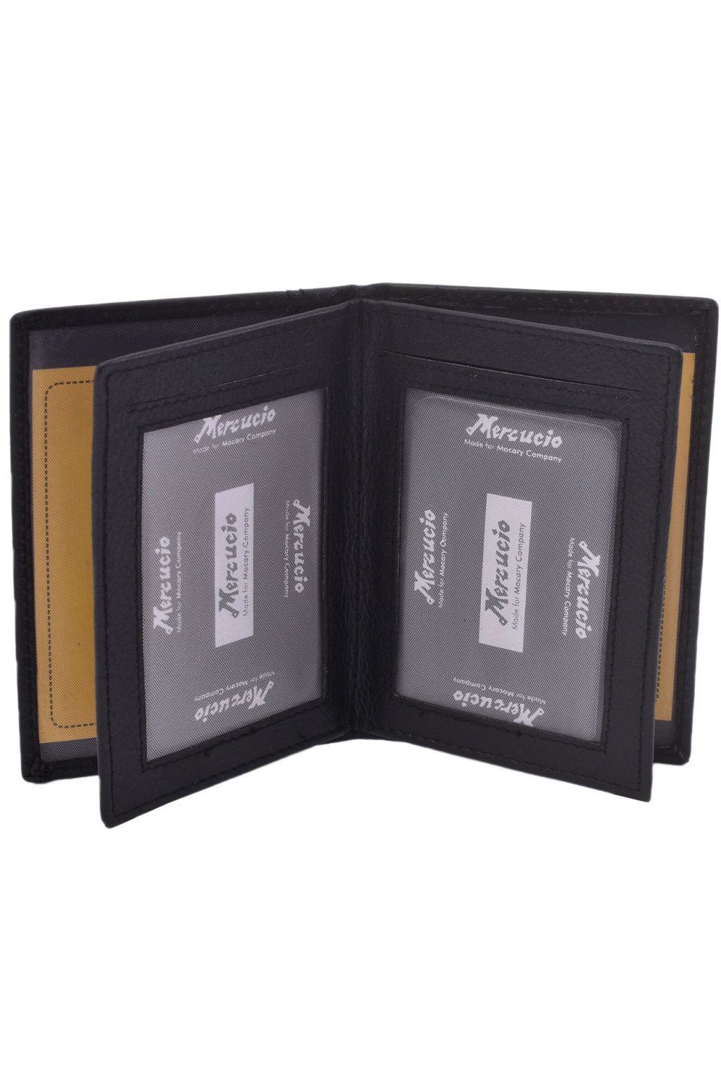 Designové a velmi praktické kožené pouzdro na doklady, klubové a kreditní karty v elegantní černé barvě. Vyznačuje se velmi kvalitním zpracováním kůže, prošitím a logem firmy MERCUCIO na čelní straně. Uvnitř naleznete průhledné přihrádky na karty, což umožňuje snadný přístup a přehlednost.