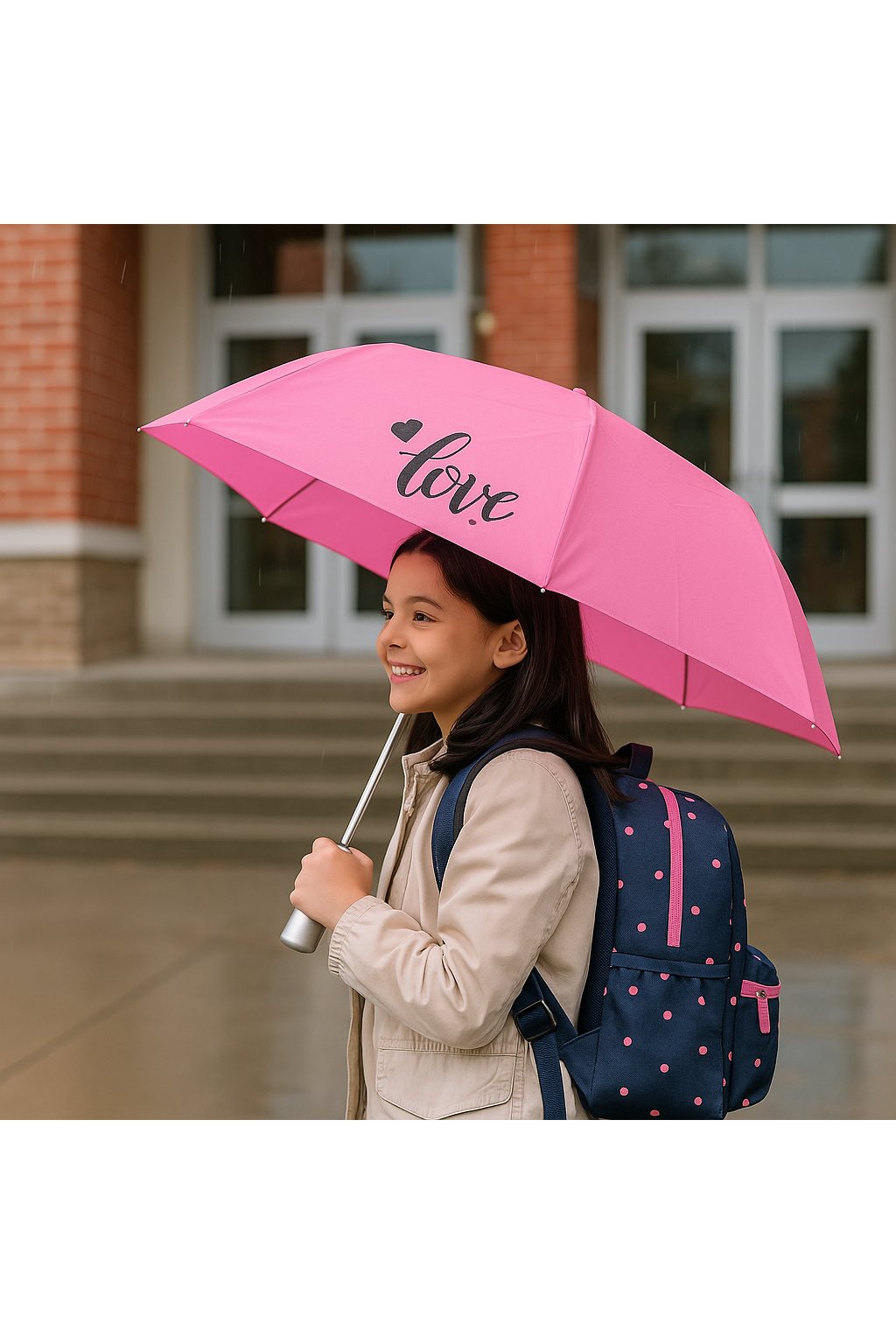 - dětský deštník v růžové barvě má trendy designový nápis love na okraji