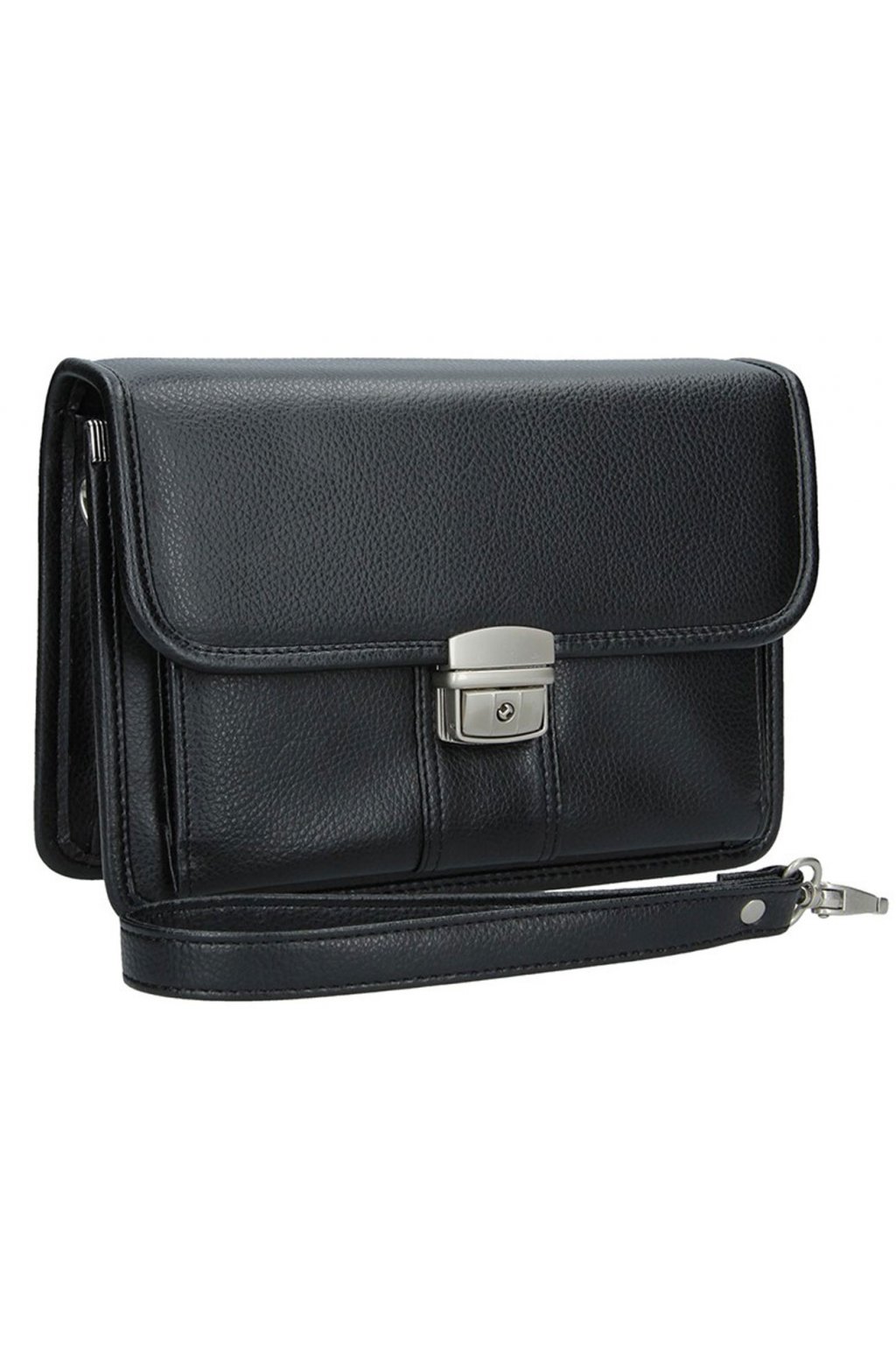 Pánská příruční taška - etue vyrobena v kombinaci ekokůže a kůže v elegantní černé barvě s klopou a zámečkem přes přední díl s prostornou členěnou vnitřní komorou na peněženku, doklady, mobil, klíče, s kapsou na zip na zadním díle a s dostatečně dlouhým poutkem na ruku.