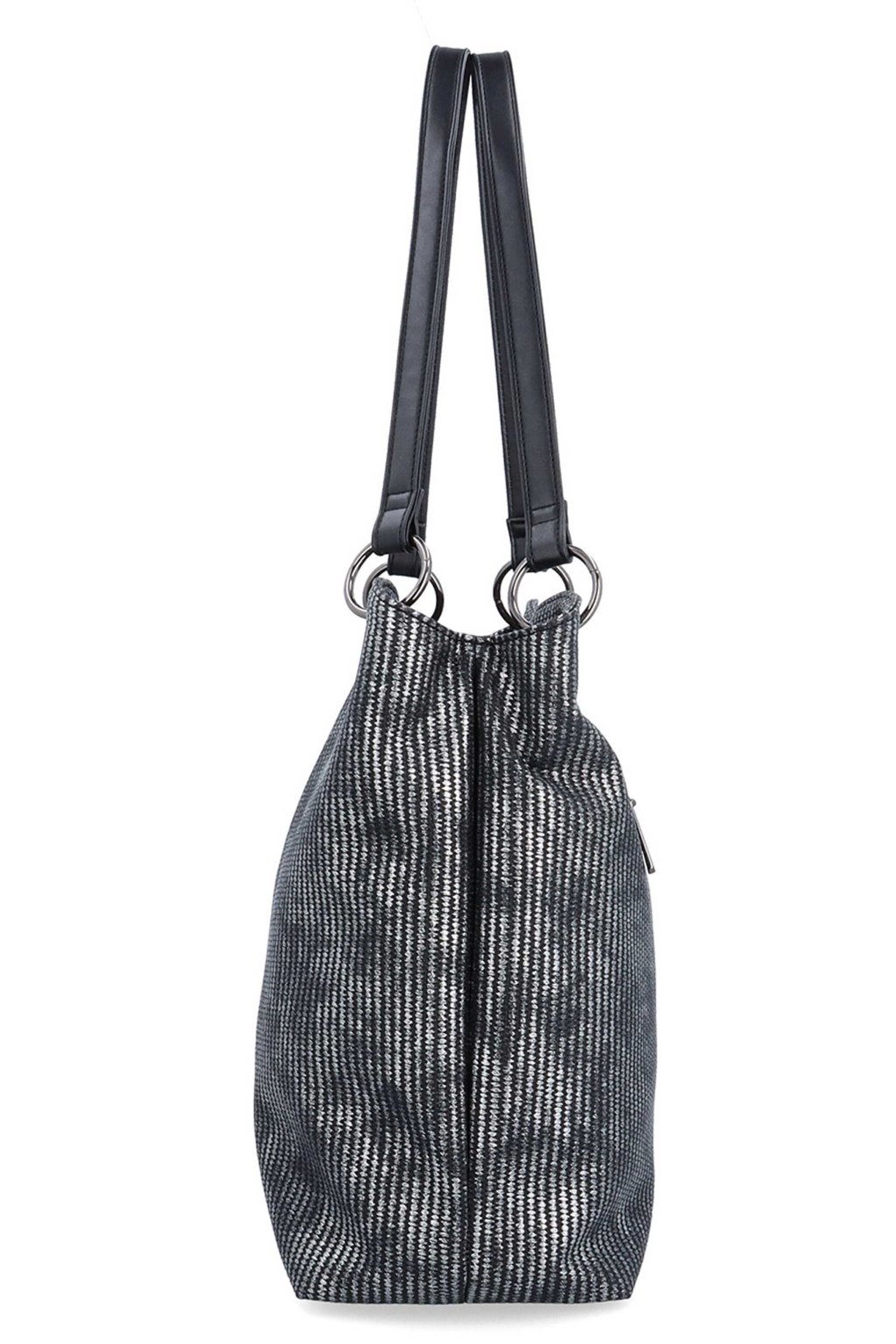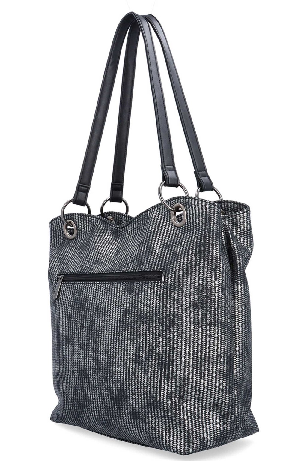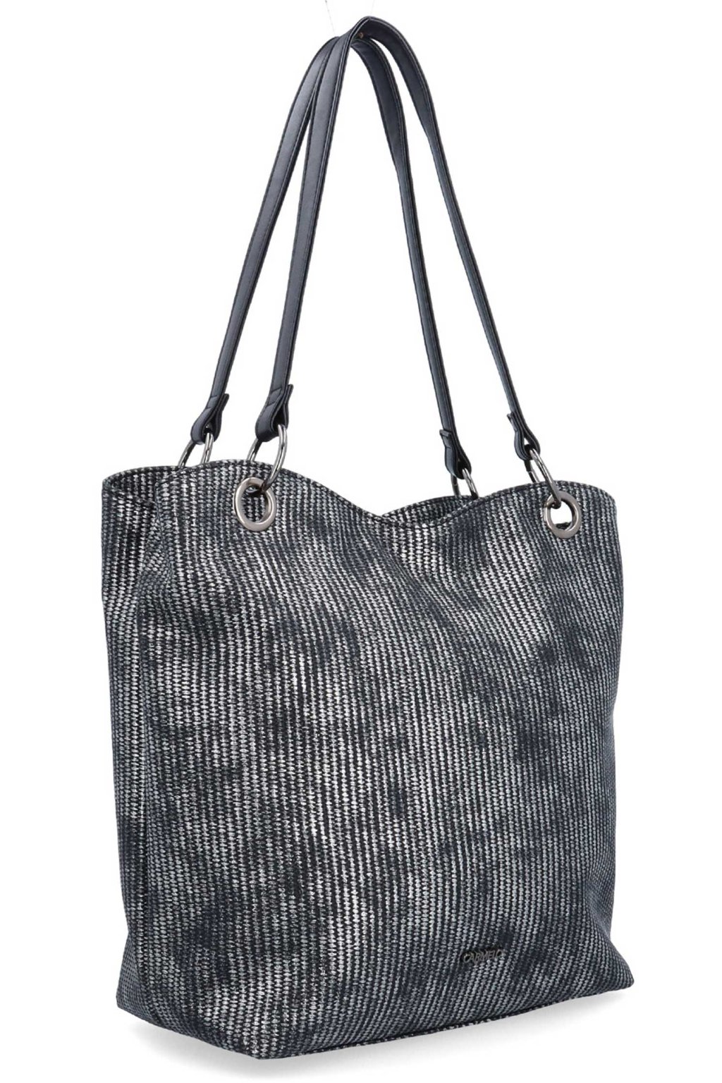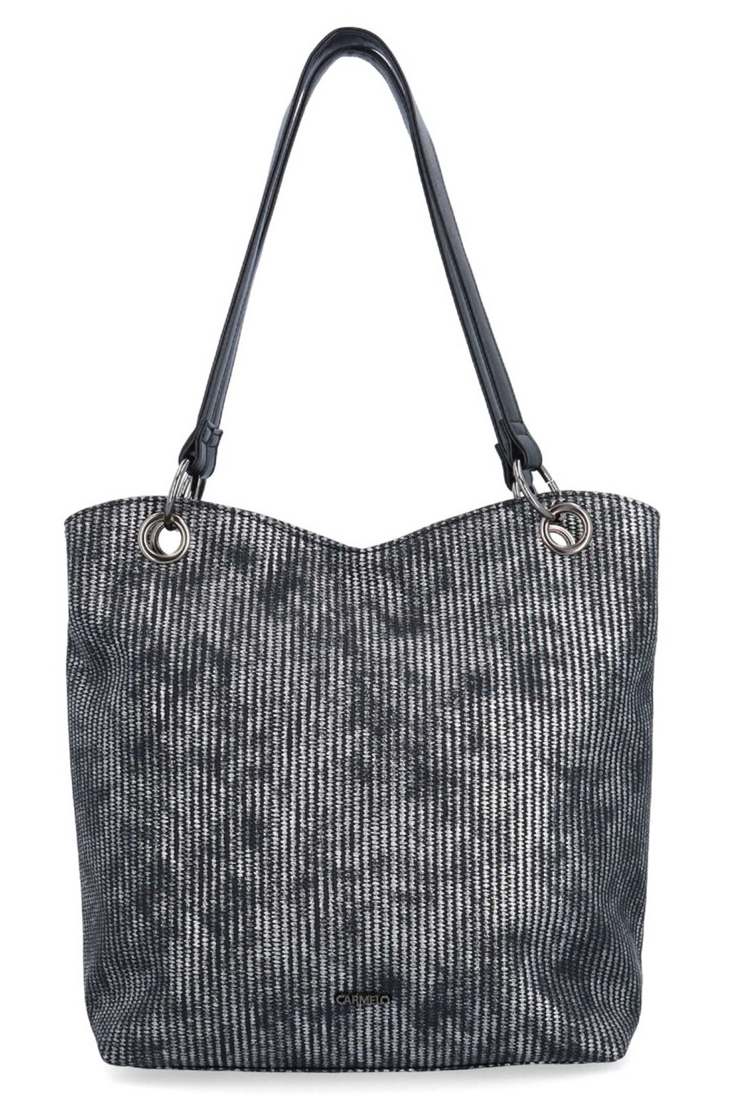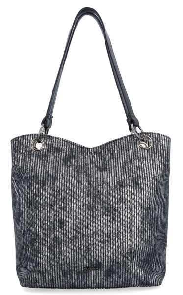 Elegantní dámská kabelka značky CARMELO v luxusní stříbrno-černé barvě. Velkou výhodou kabelky je její velký vnitřní prostor, do kterého lze pohodlně umístit formát A4 i notebook 13.3". Velmi trendy a dostatečně dlouhé jsou u této dámské kabelky její ramenní popruhy. Na zadním dílu kabelky je praktická kapsička uzavíratelná zipem. Díky jemnému vzorku a lehce lesklé povrchové úpravě působí elegantně a stylově. Dámská kabelka se dá ve své horní části celá uzavřít zipem.