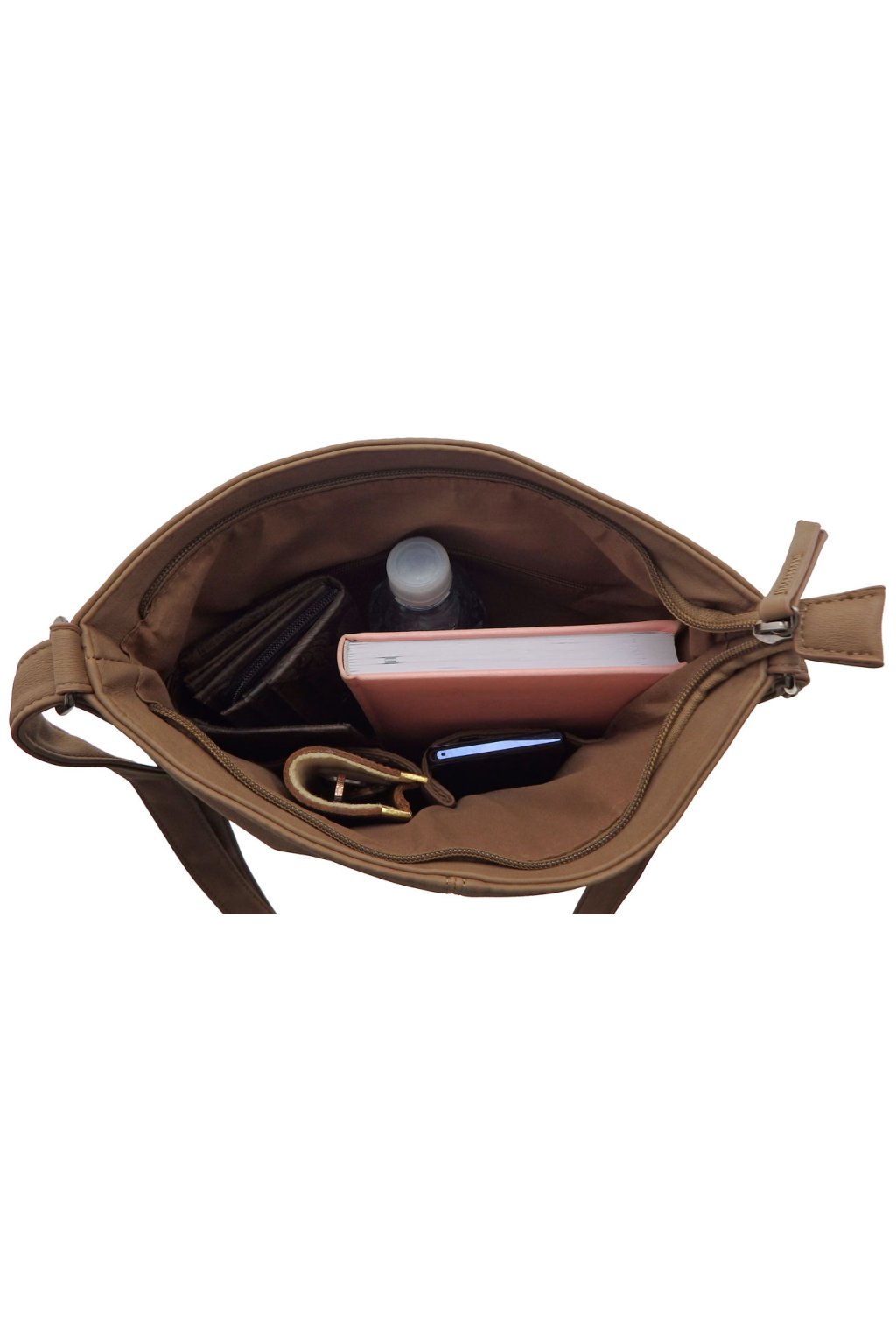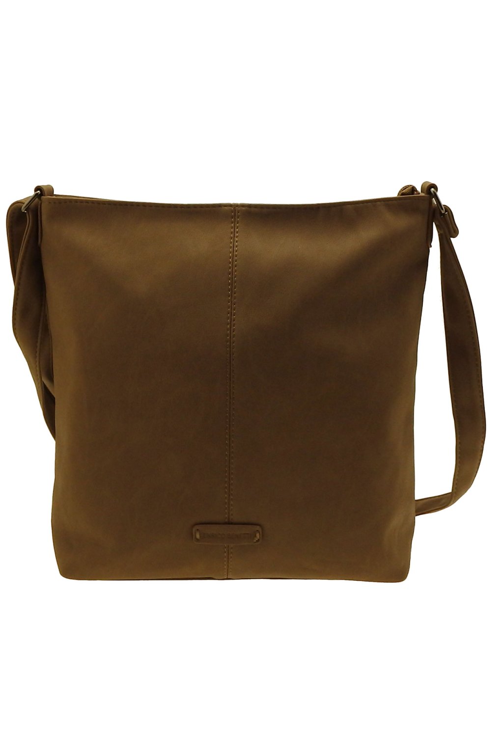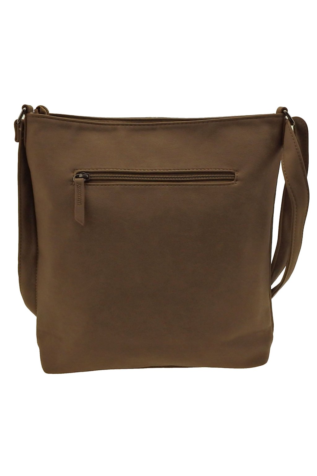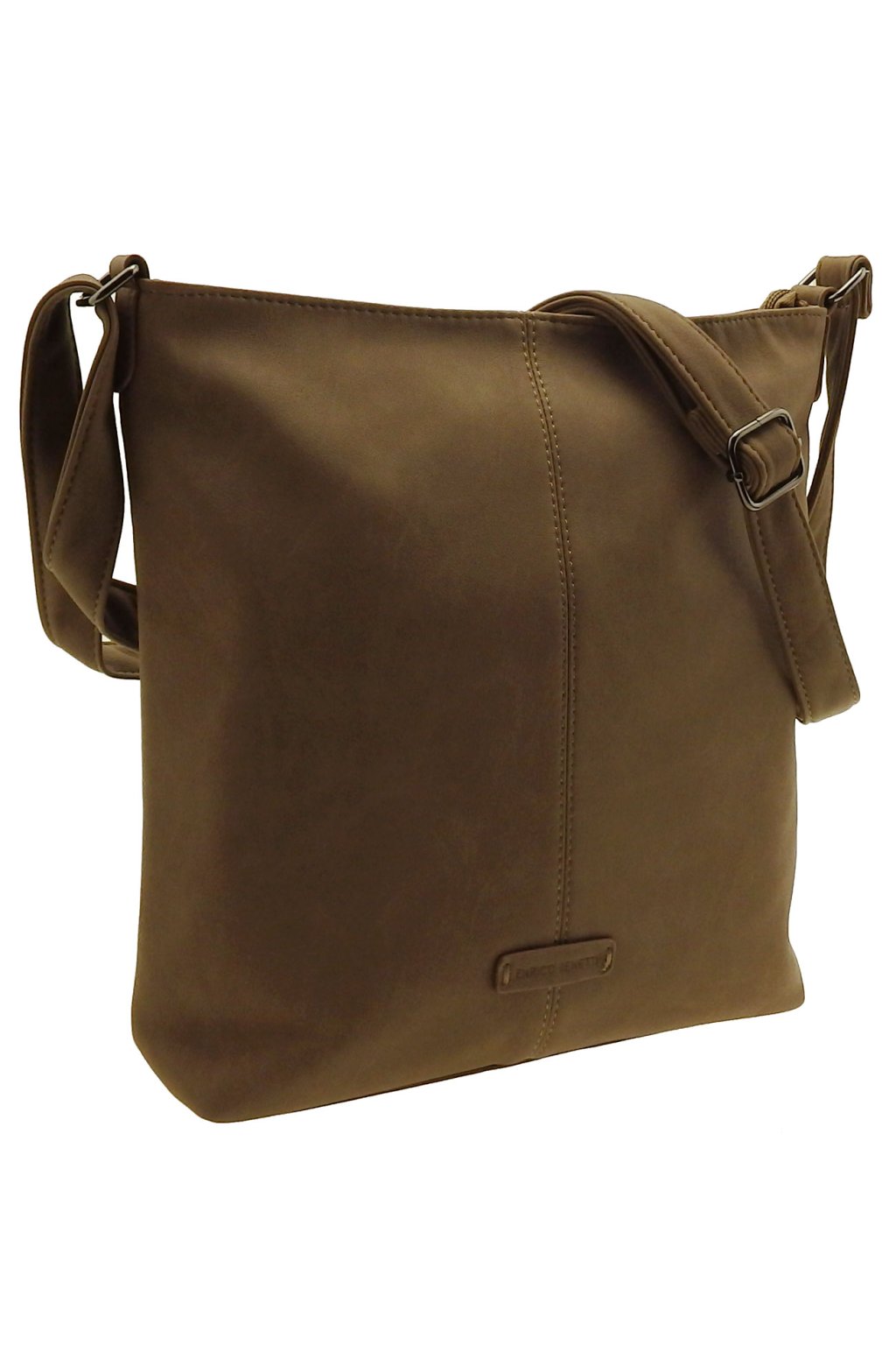 Moderní dámská kabelka holandské značky Enrico Benetti z nejnovější kolekce ,,ROZA ,, z eko-kůže v trendy hnědé barvě má nadčasový design a délkou nastavitelný popruh přes rameno. Vnitřní část kabelky, tvoří dostatečně velký prostor, do kterého lze umístit i složky formátu A5, mobil, doklady, peněženku, deštník a jiné drobnosti denní potřeby. Na zadním díle kabelky je kapsička uzavíratelná na zip. Celá dámská kabelka je chráněn proti vykradení zipem.