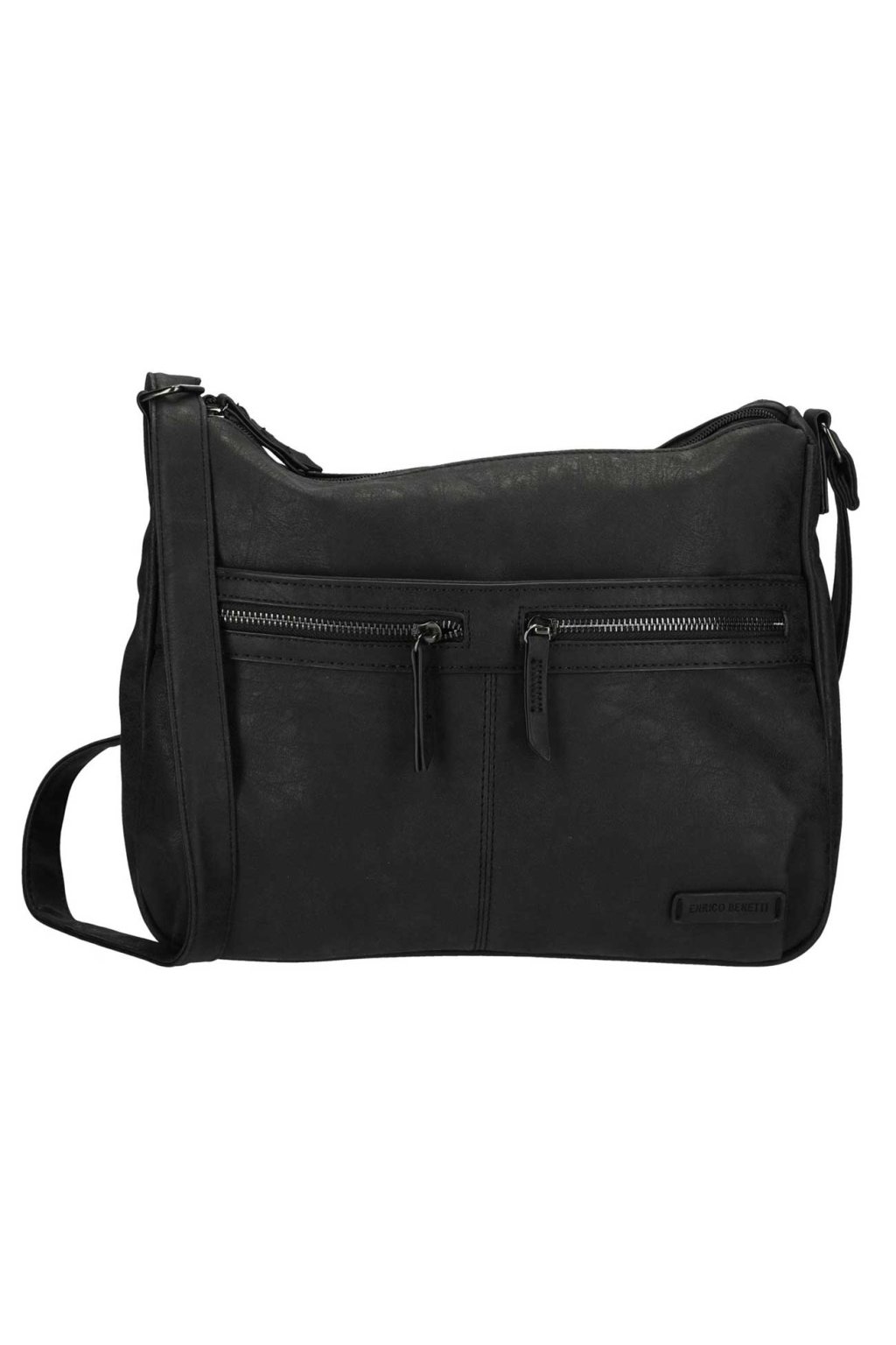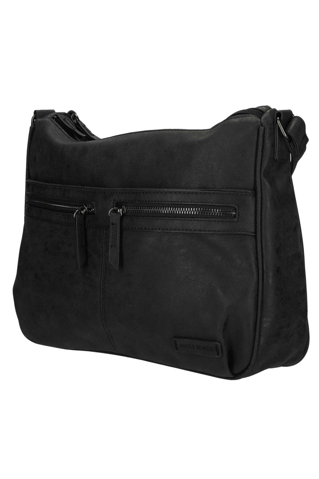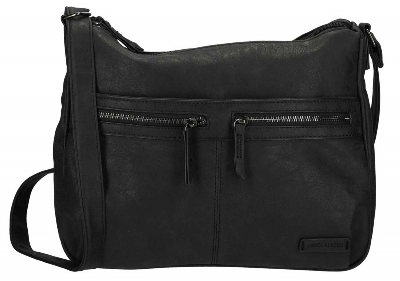 Trendy ,,crossbody,,dámská kabelka v černé barvě z kolekce značky ENRICO BENETTI má velice moderní úpravu eko-kůže a mezi zákaznicemi je tolik oblíbená pro svou praktičnost a pohodlí. Dámská kabelka má uvnitř organizér na doklady a mobil. Přední i zadní díl černé dámské kabelky zdobí kapsičky na zip. Dámská kabelka má dostatečně dlouhý nastavitelný popruh přes rameno, díky kterému lze kabelku nosit nejen přes rameno, ale také ležérně křížem přes tělo.