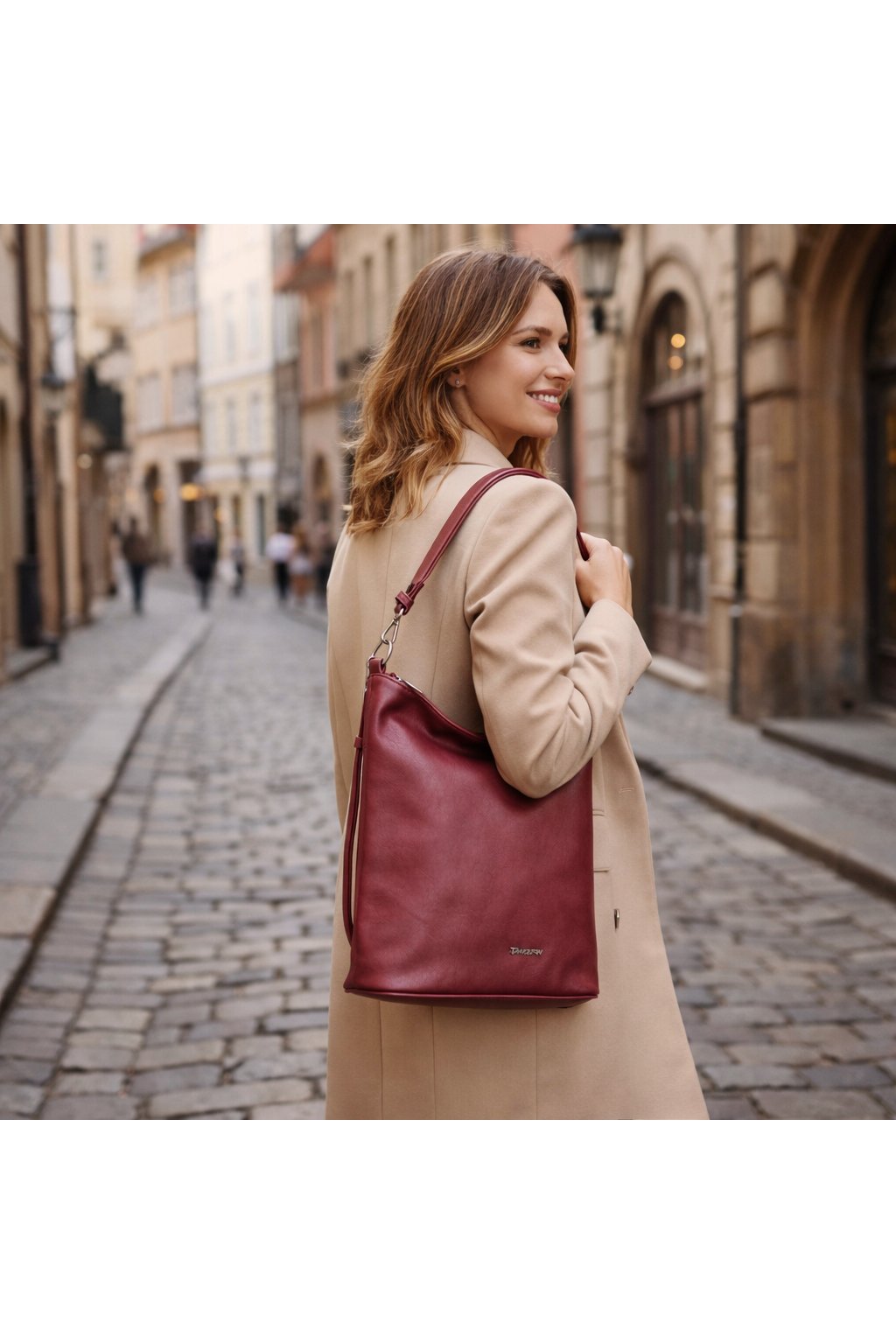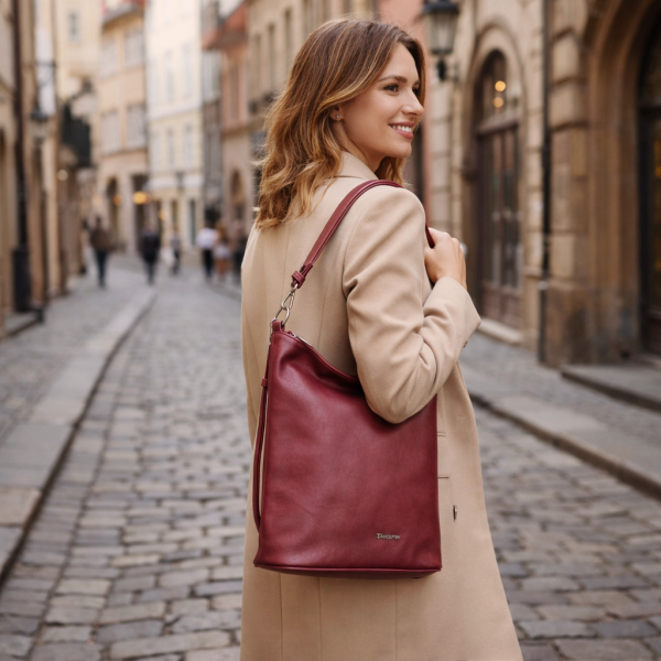 DÁMSKÁ ,,crossbody,, KABELKA přes rameno značky TANGERIN . Tato značka je zárukou kvality. Tato dámská kabelka je vyrobena z kvalitní matné eko-kůže v trendy bordó barvě. Bordó dámská kabelka je charakteristická především svým velmi trendy designem, nadčasovou eleganci, ale především svou praktičností. Velkou výhodou kabelky je její velký vnitřní prostor, do kterého lze pohodlně umístit formát A5. Skvělý vnitřní prostor kabelky Vám umožní umístit si zde Vaše doklady, peněženku, klíče, mobil, deštník a ostatní drobností denní potřeby. Díky nastavitelnému popruhu můžete tašku nosit přes rameno, ale také ležérně křížem přes tělo, díky tomu se tak stane tato ,,crossbody,, dámská kabelka přes rameno naprosto ideálním a nepostradatelným společníkem na Vaše cesty autem, vlakem, busem či letadlem. Zadní díl bordó kabelky zdobí kapsička na zip. Všechny kabelky s popruhem přes rameno této značky jsou z důvodu bezpečnosti v horní části opatřeny zipem.