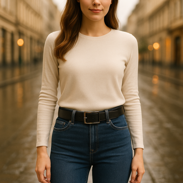Elegantní 40mm široký kožený dámský opasek v černá barvě s luxusní nadčasovou sponou v hladkém provedení, dokonale doladí každý dámský outfit.