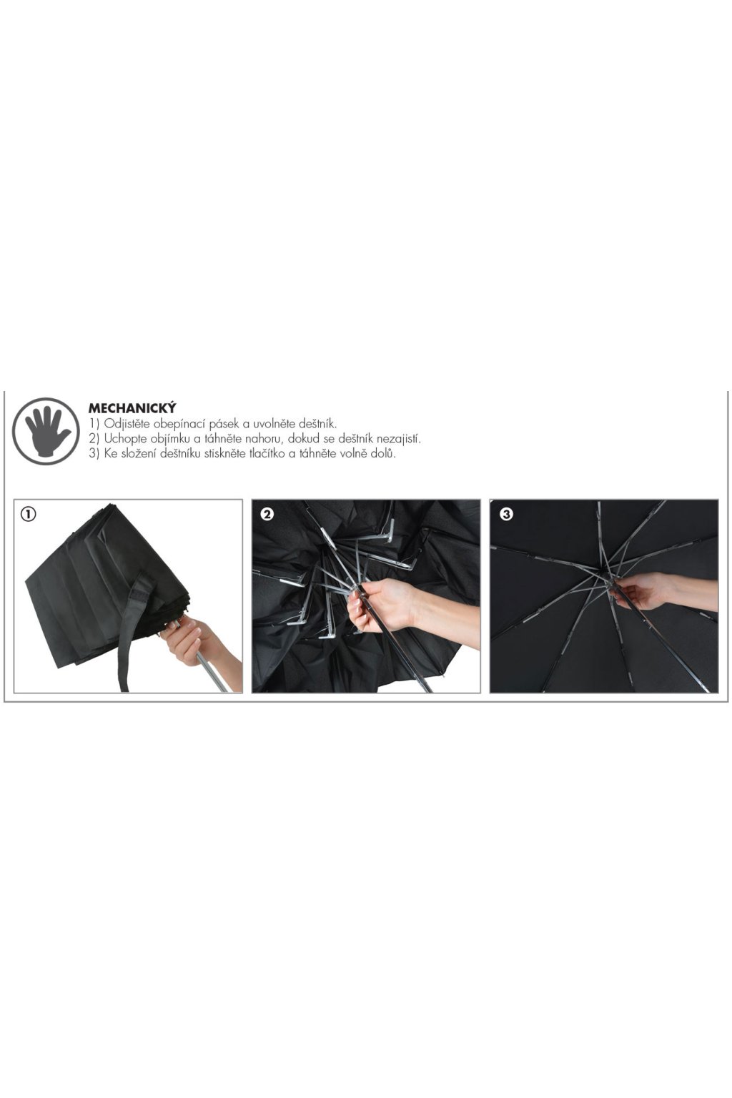 - skládací pánský deštník má ocelovou šestihrannou tyčku a pružná sklolaminátová ramena