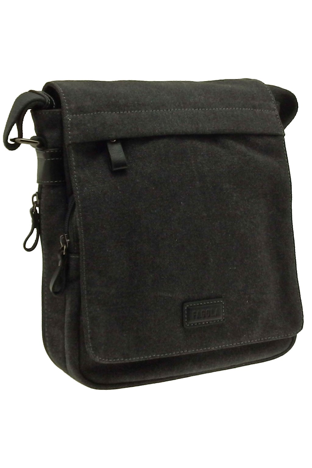 Sportovní pánská malá taška přes rameno menší Francouzské značky FAGOLA vyrobená z oděru-odolné textilie ,,Canvas,, s kapsou na předním dílu a nastavitelným popruhem k nošení přes rameno i ležérně křížem přes tělo. Vnitřní část pánské tašky tvoří dostatečně velká kapsa na iPad 10", diář A5, na peněženku, klíče a jiné drobnosti denní potřeby, vnitřní kapsička na doklady uzavíratelná na zip a kapsička na mobil. Na přední i zadní části je kapsička uzavíratelná na zip.