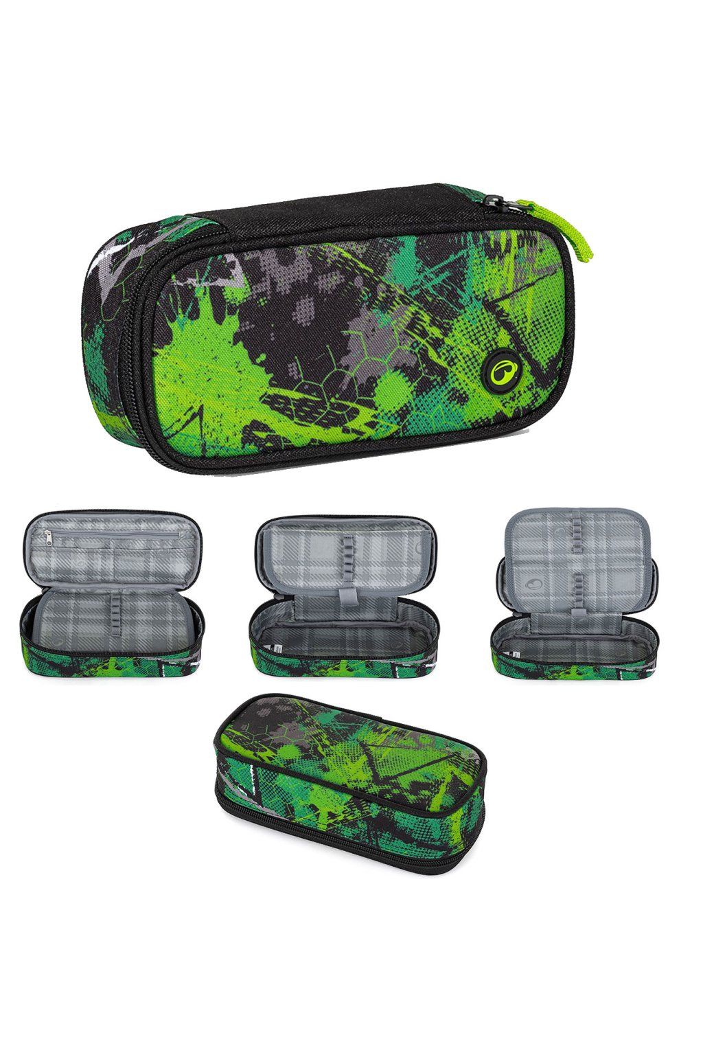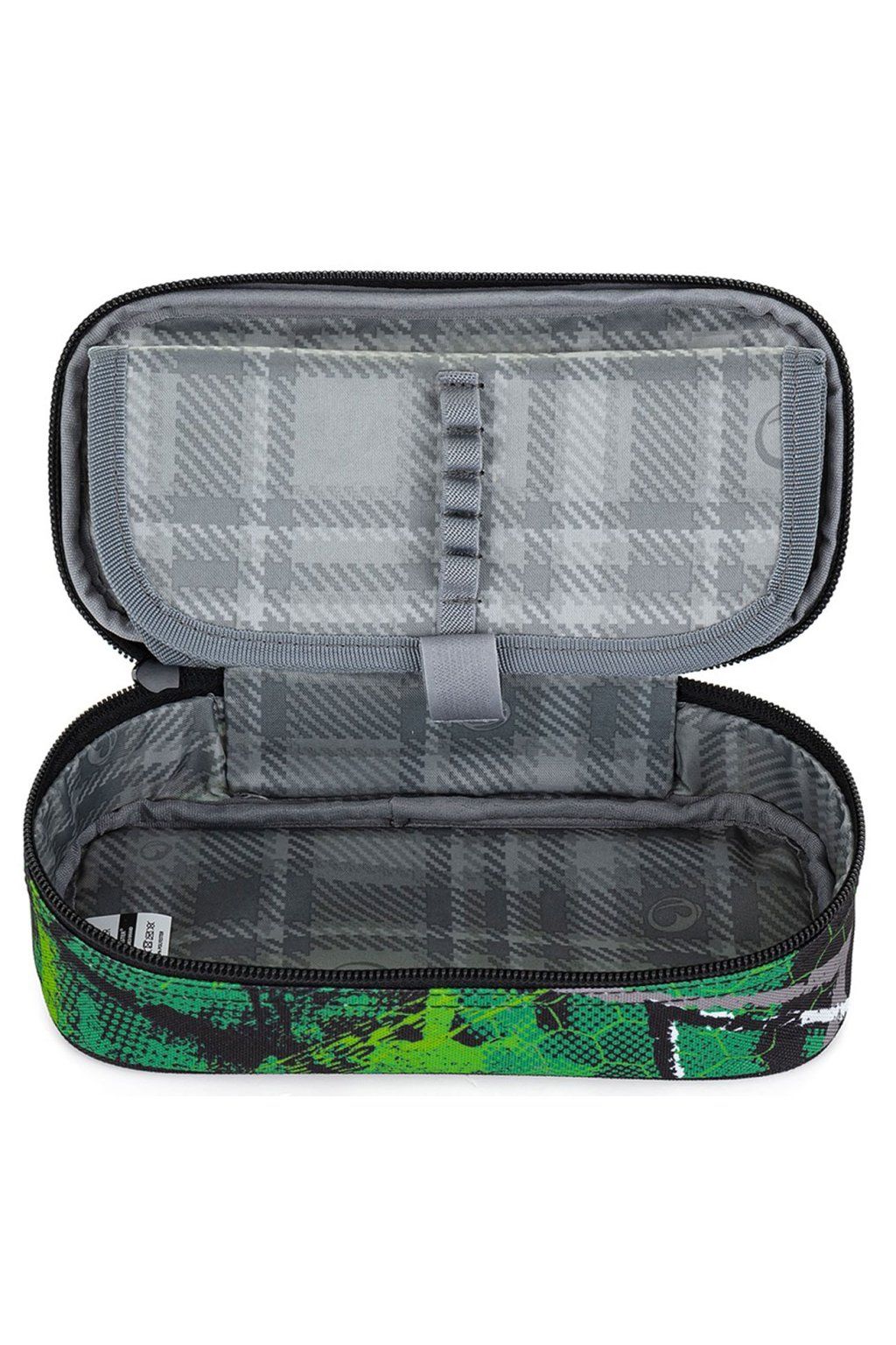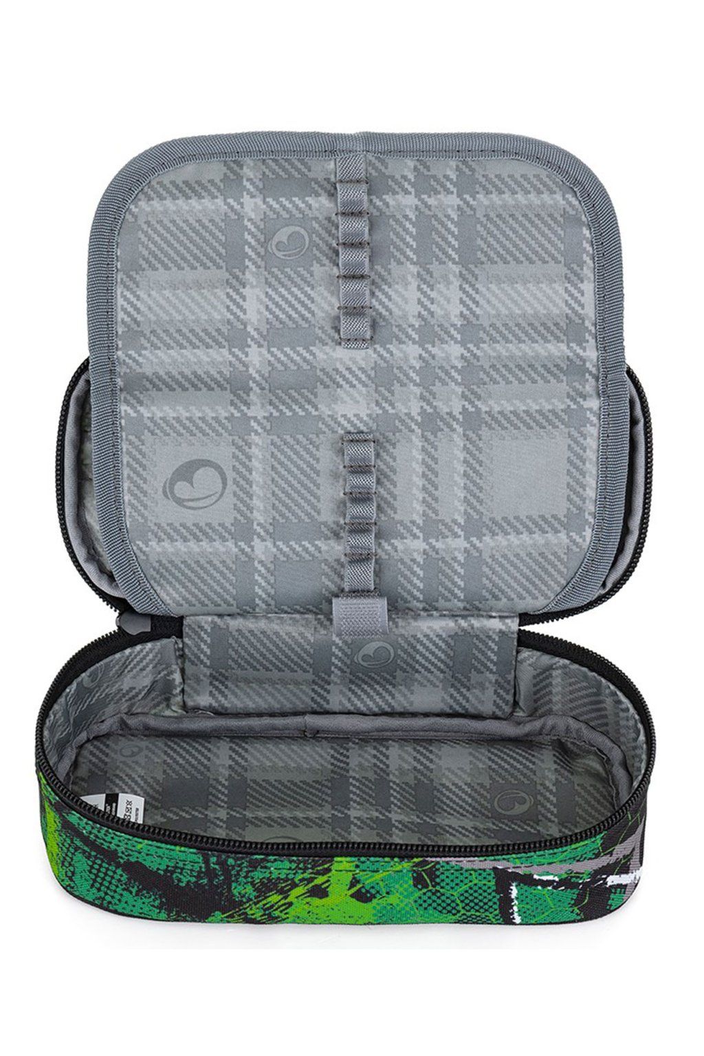 Trendy studentské pouzdro-etue z nové kolekce firmy BAGMASTER je svým vnitřním uspořádáním vhodné nejen pro druhý stupeň ZŠ, ale také pro středoškoláky. Studentský penál je po celém svém obvodu vypolstrovaný a navíc ve spodní i horní části zpevněný lemovkou. Velmi snadnou manipulaci se zipy u tohoto typu pouzdra umožňují dostatečně dlouhé zipové koncovky. Do dostatečně velkého vnitřního prostoru lze opravdu pohodlně umístit na volno pastelky a fixy a pod úchyty z gumiček pak propisky, tužky a jiné psací potřeby. Do síťované kapsičky na horní klopně pak kružítko, pravítko a jiné drobnosti školáčky-studenty.