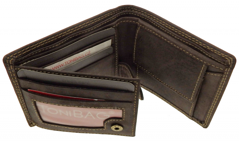 Pánská kožená peněženka malá vyrobená z hovězí kůže je charakteristická především hladkou úpravou povrchové kůže a dnes tolik moderní hnědou barvou a logem firmy na čelní straně peněženky. A stejně jako všechny pánské kožené peněženky této značky se i tato vyznačuje praktičností, neboť do ní pohodlně umístíte bankovky, doklady, klubové i kreditní karty. Uvnitř této peněženky se nachází samostatná kapsa na drobné mince uzavíratelná na druk, dvě prostorné kapsy na bankovky s vnitřní kapsičkou na zip a organizér na 12 ks kreditních a klubových karet, které lze k sobě připnout zápinkou.
