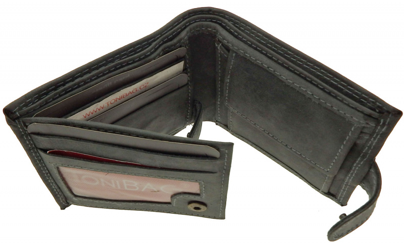 Pánská kožená peněženka vyrobená z hovězí kůže je charakteristická především hladkou úpravou povrchové kůže a dnes tolik moderní černou barvou a logem firmy na čelní straně peněženky. A stejně jako všechny pánské kožené peněženky této značky se i tato vyznačuje praktičností, neboť do ní pohodlně umístíte bankovky, doklady, klubové i kreditní karty. Uvnitř této peněženky se nachází samostatná kapsa na drobné mince uzavíratelná na druk, dvě prostorné kapsy na bankovky a organizér na 7 ks kreditních a klubových karet. Celou pánskou koženou peněženku lze sepnout zápinkou.