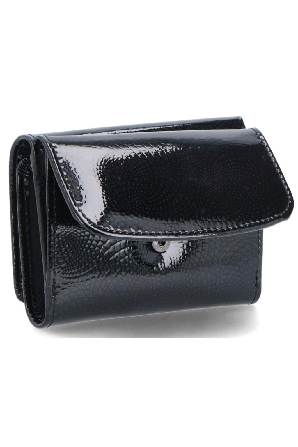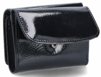 - dámská kožená peněženka má moderní tvar, černou lakovanou barvu a jemným prošitím na okraji peněženky, což umocňuje její trendy vzhled