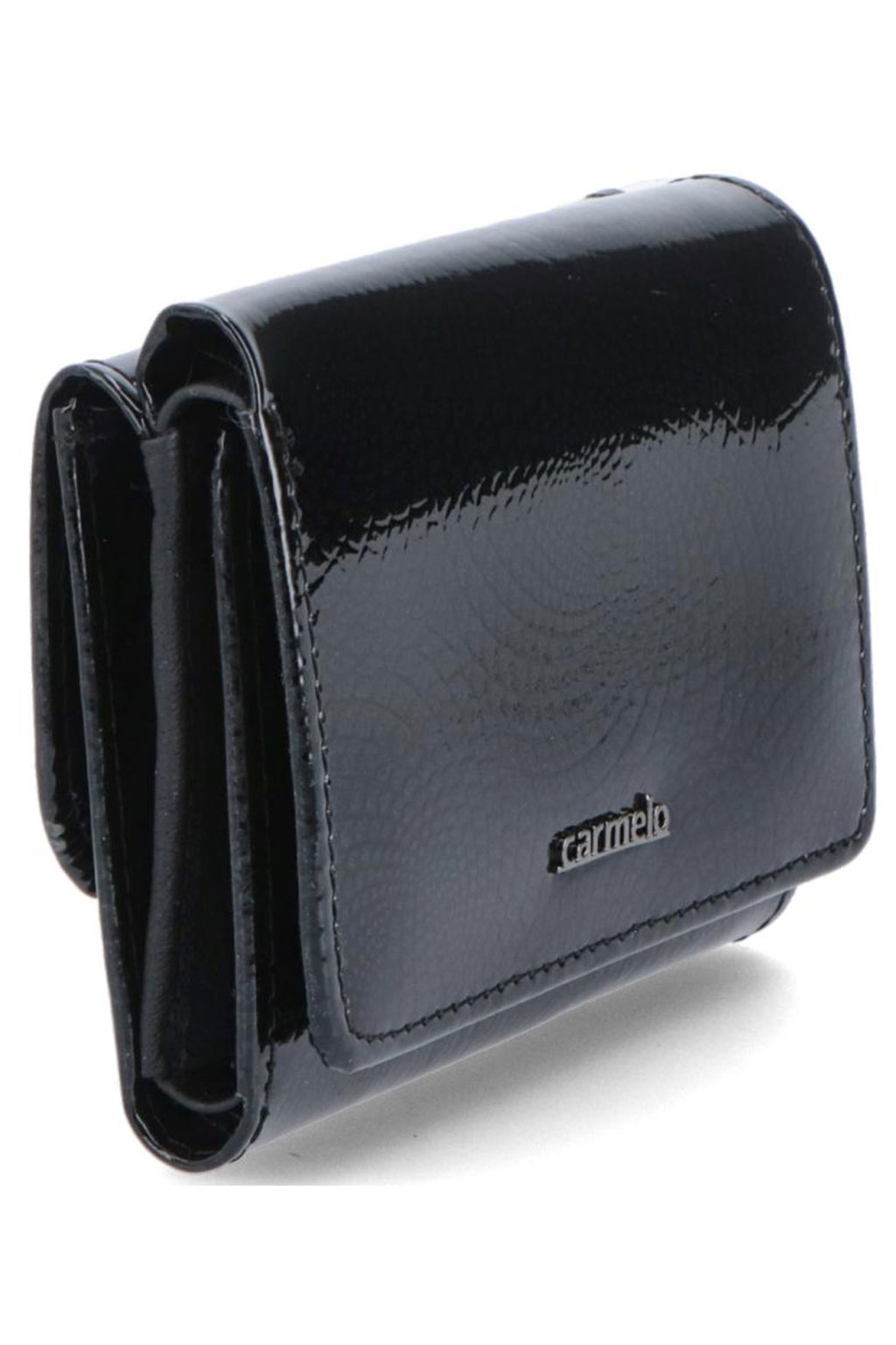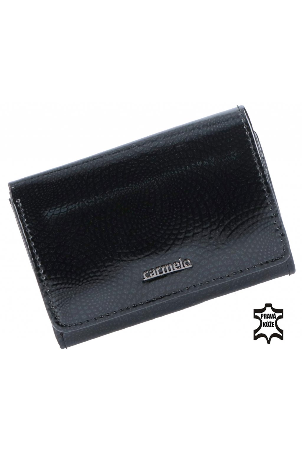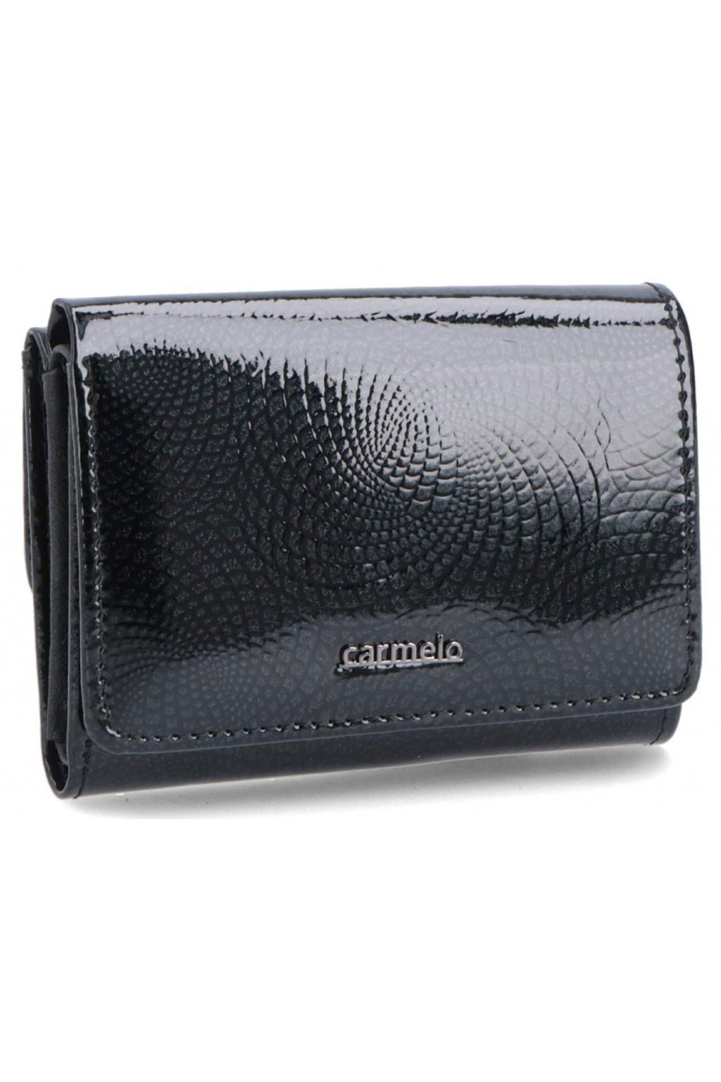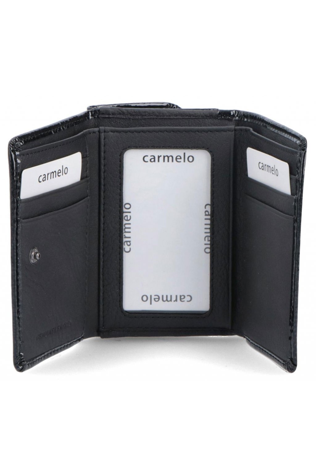 Dámská peněženka Carmelo z lakované kůže s jemným vzorkem. Peněženka disponuje mnoho přihrádkami jako je např. 6 přihrádek na karty, přihrádkou na bankovka a drukovou kapsou na mince. Přední klopa je u této černé kožené dámské peněženky z důvodu většího zabezpečení opatřena a uzavíratelná na druk.