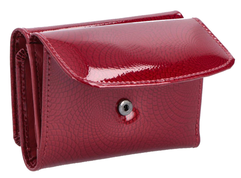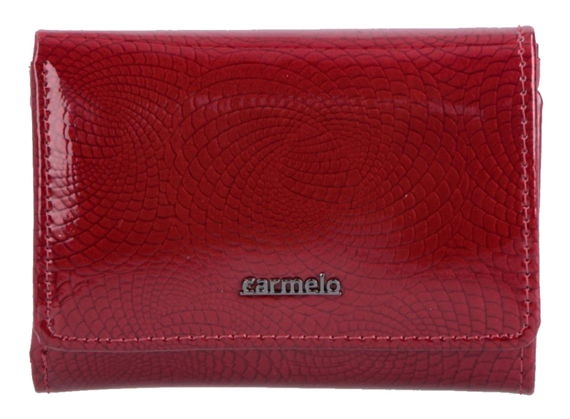 Dámská peněženka Carmelo z lakované kůže s jemným vzorkem. Peněženka disponuje mnoho přihrádkami jako je např. 6 přihrádek na karty, přihrádkou na bankovka a drukovou kapsou na mince. Přední klopa je u této červené kožené dámské peněženky z důvodu většího zabezpečení opatřena a uzavíratelná na druk.