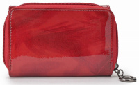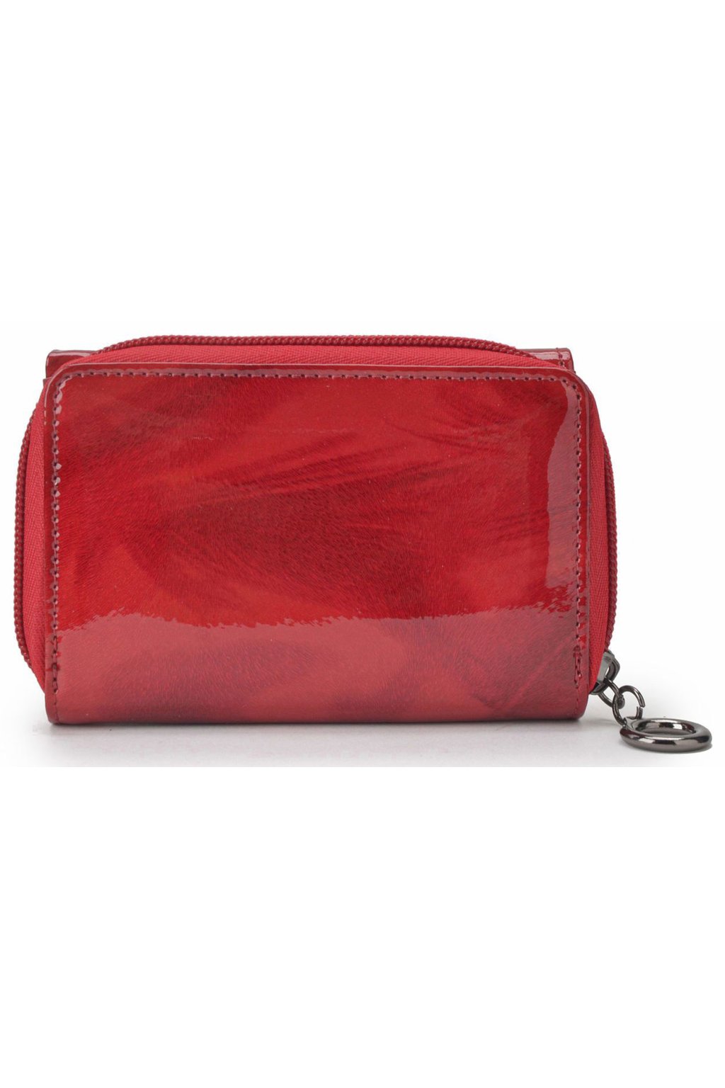 Dámská peněženka Carmelo z lakované kůže s motivem peříček. Peněženka disponuje mnoho přihrádkami jako je např. 6 přihrádek na karty, přihrádkou na bankovka a zipovou kapsou na mince. Přední klopa je u této červené kožené dámské peněženky z důvodu většího zabezpečení opatřena a uzavíratelná na druk.