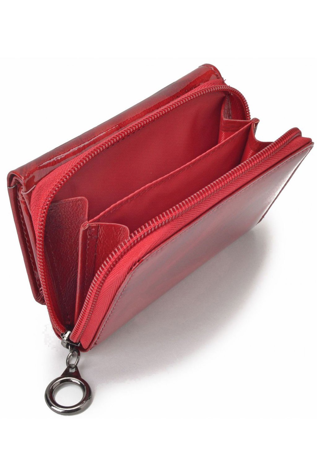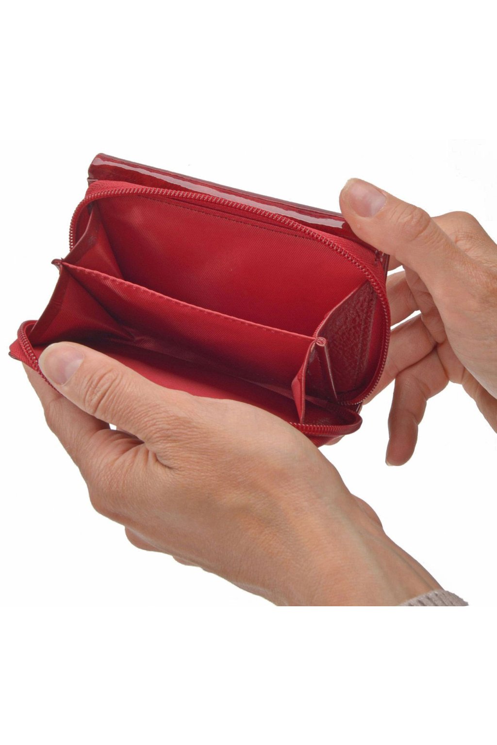 - dámská kožená peněženka má moderní tvar, červenou lakovanou barvu a jemným prošitím na okraji peněženky, což umocňuje její trendy vzhled