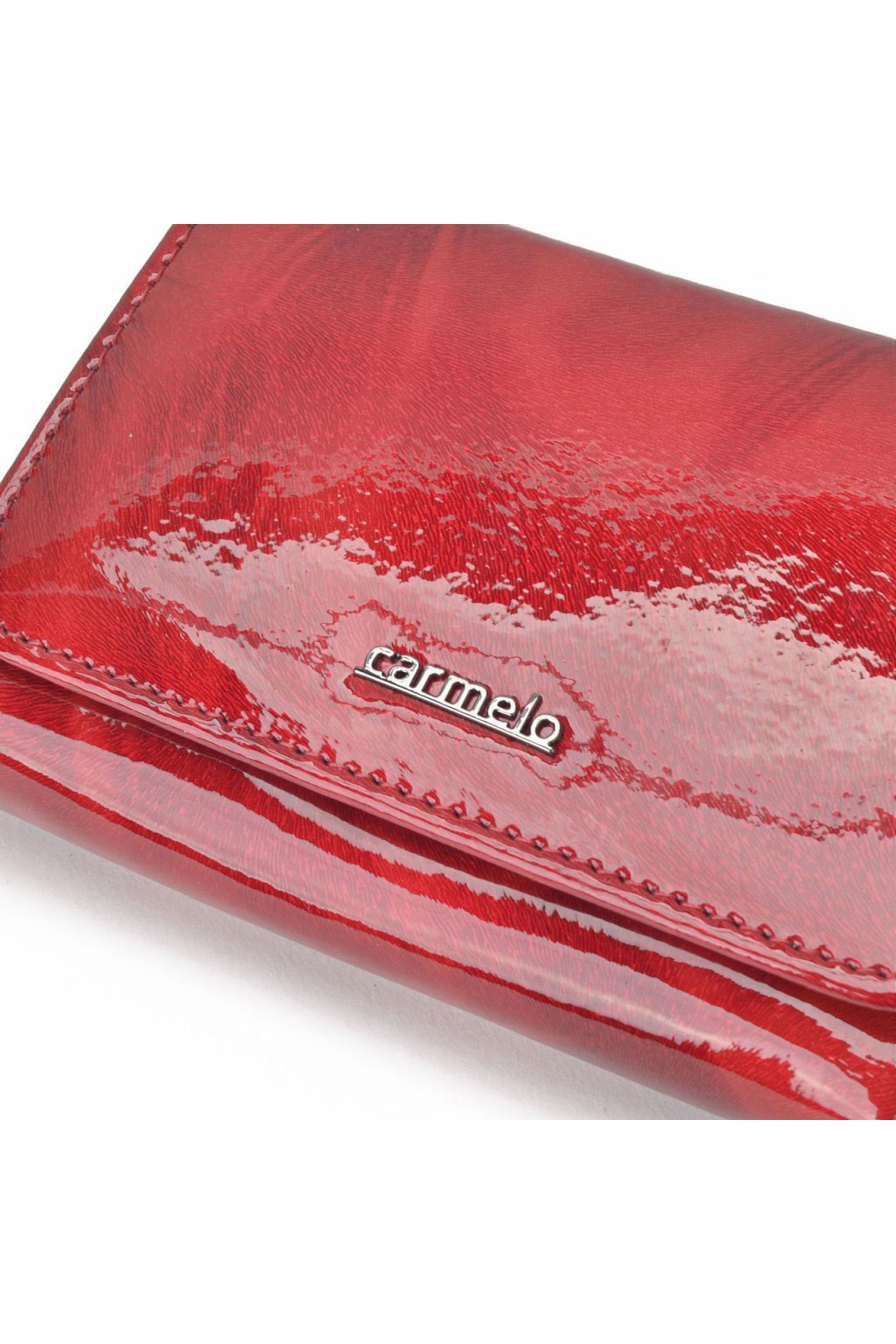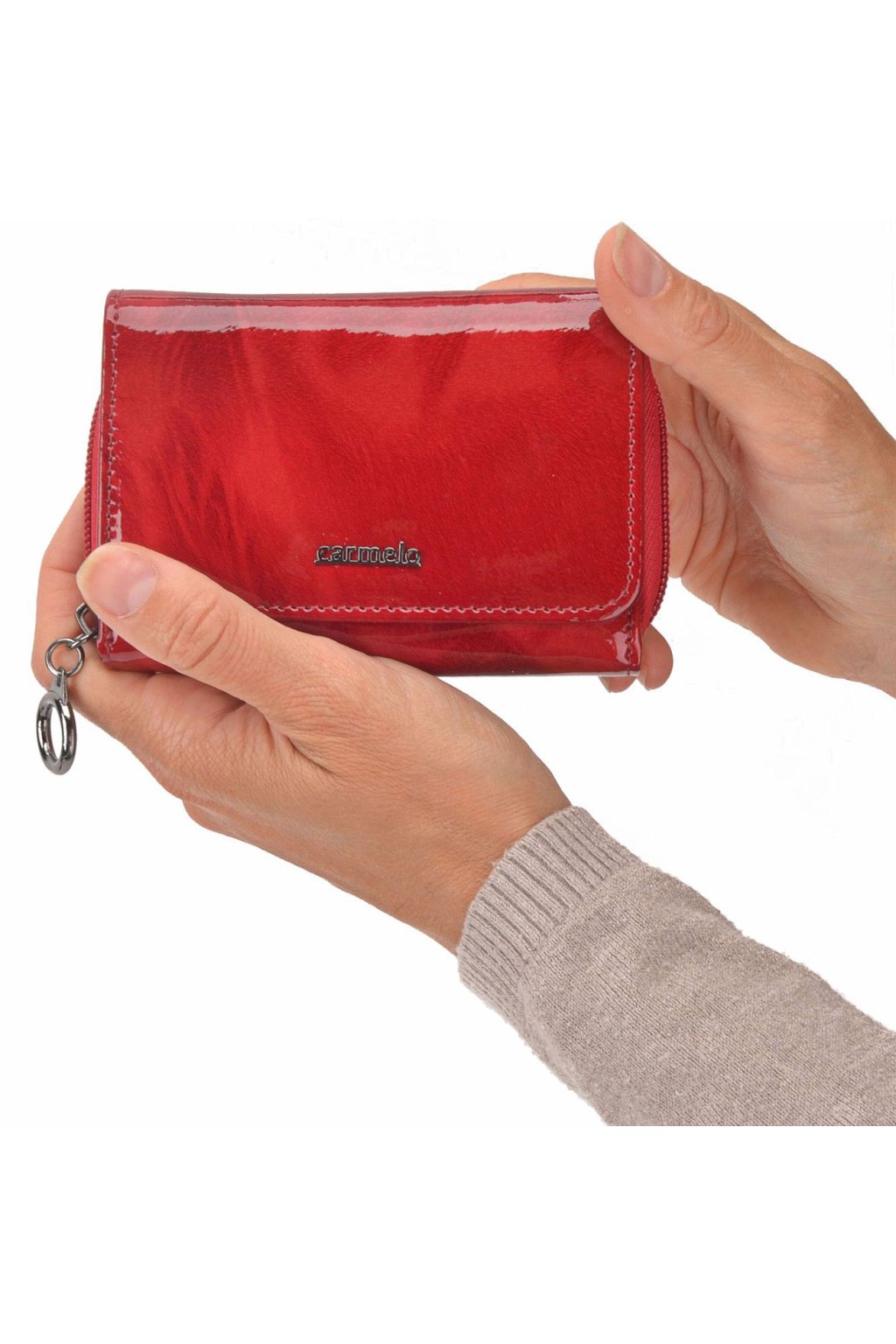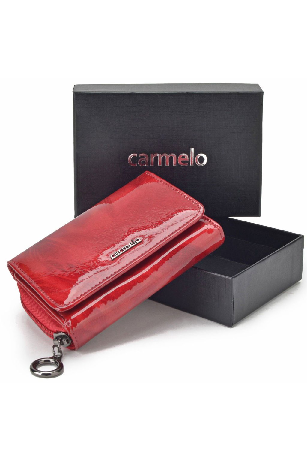 Dámská kožená peněženka z kolekce značky CARMELO je charakteristická svým trendy tvarem, úpravou povrchové kůže a jemným prošitím po okrajích peněženky. A stejně jako všechny kožené peněženky této značky se i tato vyznačuje svou praktičností, neboť do ní pohodlně umístíte mince, bankovky, doklady, klubové i kreditní karty. Součástí této dámské kožené peněženky se nachází kapsička na drobné mince, kterou lehce uzavřete na zip. Vnitřní část červené dámské peněženky tvoří dále také 1 kapsa na bankovky, větší kapsičky na doklady a organizér na 7 ks kreditní a klubové kartičky. Přední klopa je u této červené kožené dámské peněženky z důvodu většího zabezpečení opatřena a uzavíratelná na druk.