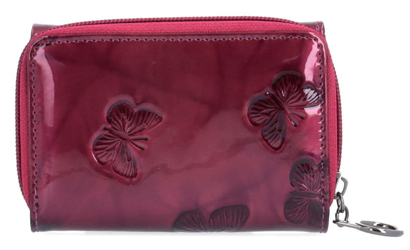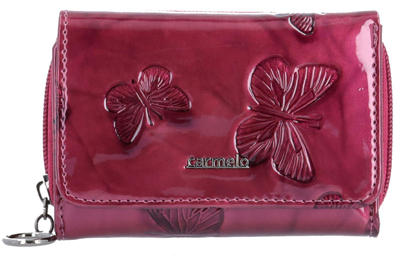 Dámská peněženka Carmelo z lakované kůže s motýlím vzorkem. Peněženka disponuje mnoho přihrádkami jako je např. 6 přihrádek na karty, přihrádkou na bankovky a zipovou kapsou na mince. Přední klopa je u této fialové kožené dámské peněženky z důvodu většího zabezpečení opatřena a uzavíratelná na druk.