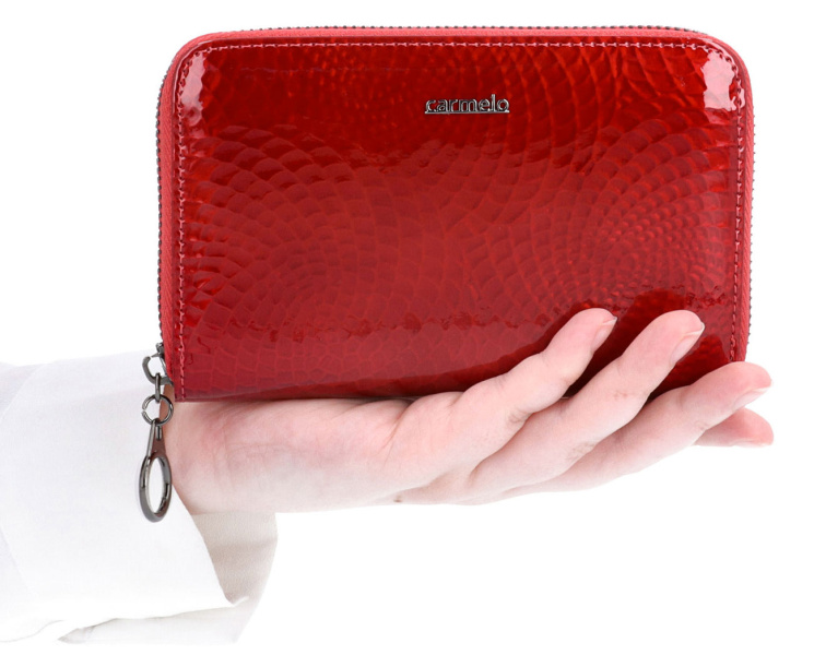 Dámská kožená peněženka z kolekce firmy CARMELO v elegantní červené lakované barvě s trendy úpravou povrchové kůže. Peněženka má uvnitř prostor na drobné mince uzavíratelný na zip, 4 komory na bankovky, 6 kapsičky na doklady a organizér na 6 ks platebních a klubových karet. Dámská červená kožená peněženka je chráněna zipem.