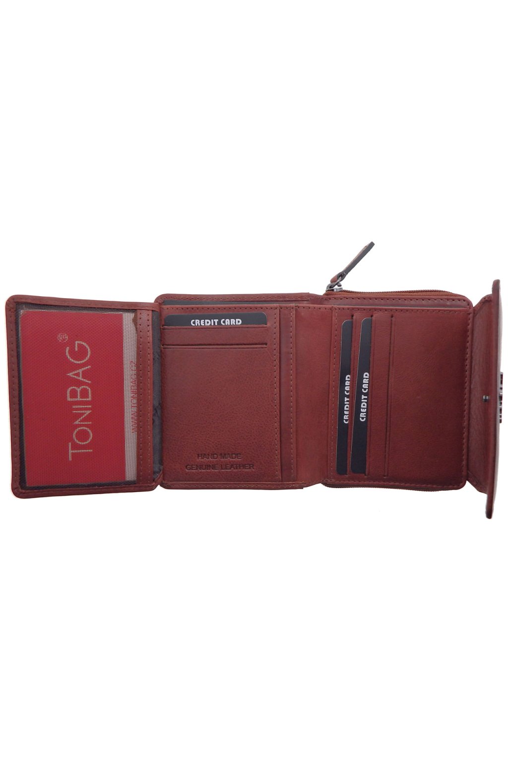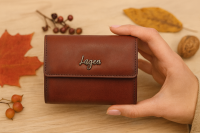 - dámská kožená peněženka v trendy hnědé barvě s elegantní úpravou povrchové kůže a prošitím po obvodu na přední části, což umocňuje její vzhled