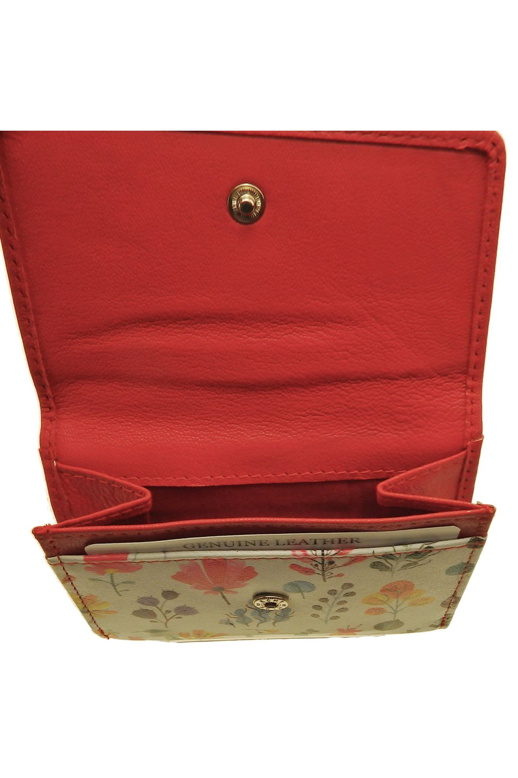 Dámská kožená peněženka z kolekce firmy DD v bíločervené barvě se vzorem květu má trendy tvar, menší rozměr, přesto velmi přehledné vnitřní uspořádání. Peněženka má na předním díle prostor na drobné mince uzavíratelný zápinkou a pod ním druhý přehledný prostor na bankovky a kapsičky na 4 kreditní karty, také tento prostor je uzavíratelný zápinkou.
