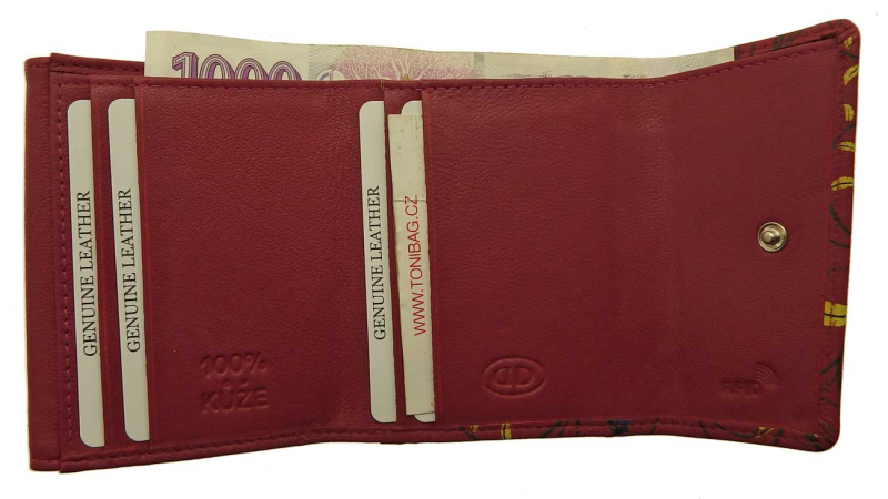 - přední díl této dámské peněženky tvoří prostorná kapsa na mince celá uzavíratelná na druk