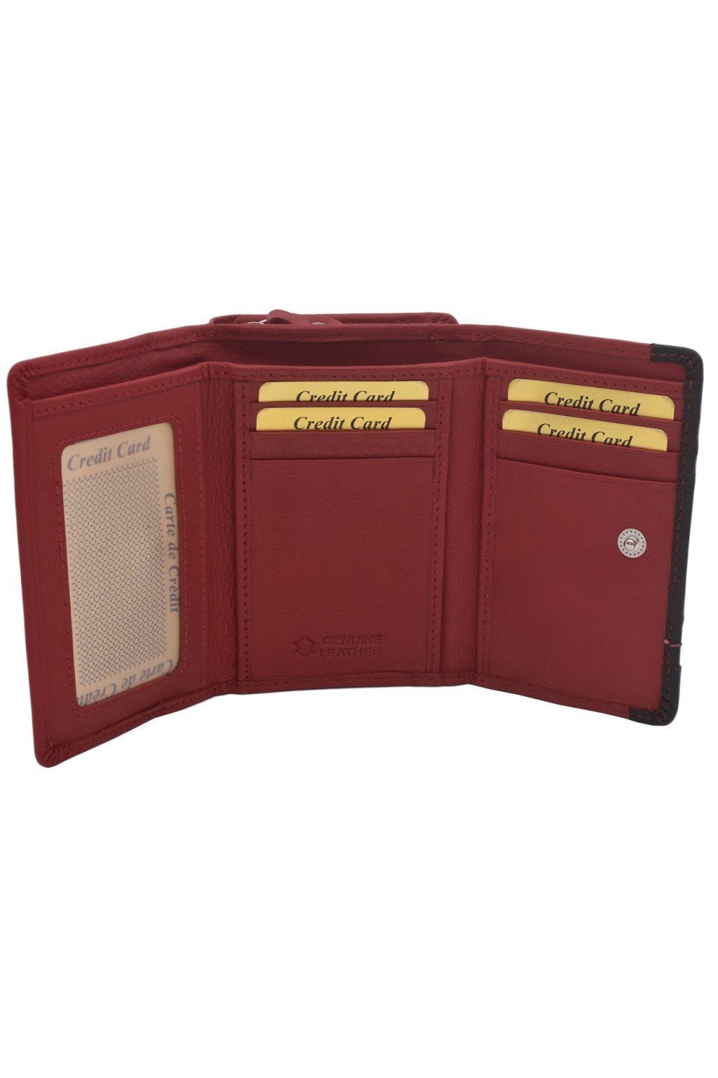 - z důvodu zabezpečení se tato červená dámská kožená peněženka celá na klopě přední části uzavírá drukem