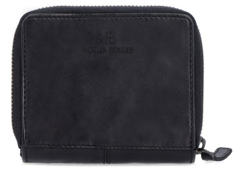 Dámská kožená peněženka z kolekce firmy NOELIA BOLGER v elegantní černé barvě s trendy úpravou povrchové kůže. Peněženka má prostor na drobné mince uzavíratelný na zip, 2 komory na bankovky a organizér na 8 ks platebních a klubových karet. Dámská černá kožená peněženka je chráněna klopou na druk.