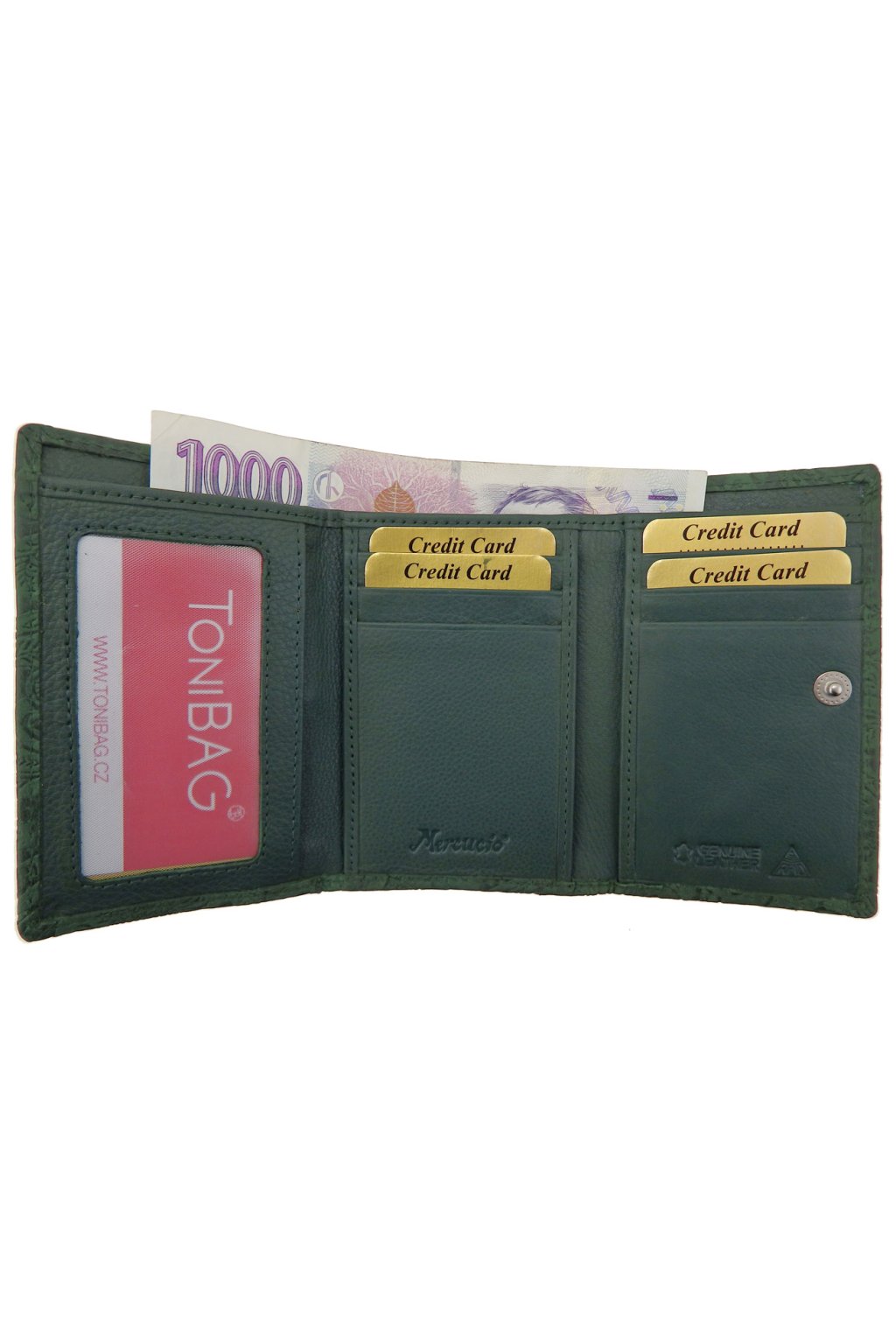 Dámská kožená peněženka z kolekce firmy MERCUCIO v zelené barvě je charakteristická svou luxusní úpravou povrchové kůže. Právě díky zpracování kůže a své praktičnosti se dámské kožené peněženky od firmy MERCUCIO těší velké spokojenosti u spousty zákaznic. A stejně jako všechny dámské kožené peněženky této firmy se i tato vyznačuje svou praktičností, neboť do ní pohodlně umístíte mince, bankovky, doklady, klubové i kreditní karty. Venkovní část dámské zelené kožené peněženky tvoří kapsička na drobné mince, kterou lehce uzavřete na zip, 1 komora na bankovky a navíc organizér na 9 ks platebních a klubových karet. Přední klopa je u této zelené kožené dámské peněženky z důvodu většího zabezpečení opatřena a uzavíratelná na druk.