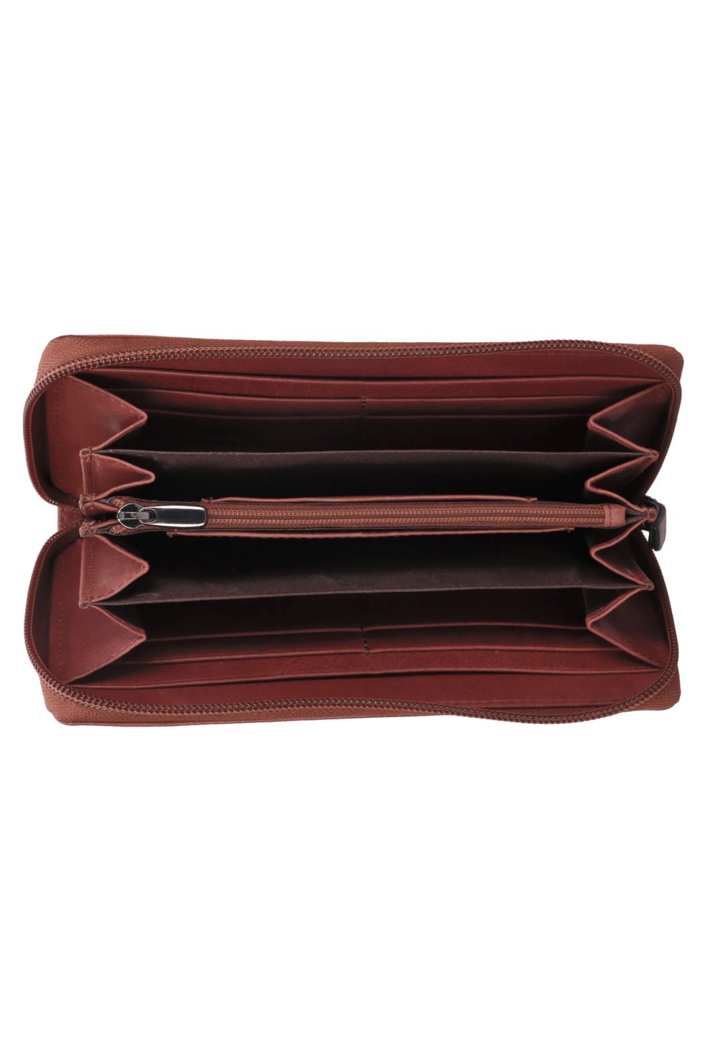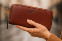 Dámská peněženka kožená z kolekce značky LAGEN v hnědé barvičce s jemným prošitím v okraji peněženky, což umocňuje její trendy vzhled. Peněženka má uvnitř prostor na drobné mince uzavíratelný na zip, 4 komory na bankovky, 3 kapsičky na doklady a organizér na 10 ks platebních a klubových karet. Hnědá dámská kožená peněženka se po celém svém obvodu uzavírá na zip.