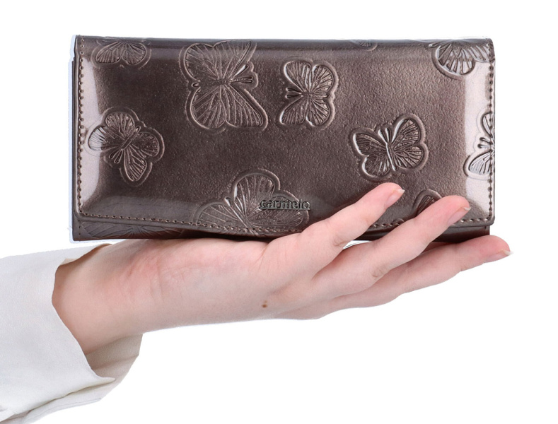 Dámská kožená peněženka z kolekce firmy CARMELO v béžové barvě je charakteristická svou luxusní lakovanou úpravou povrchové kůže. Právě díky zpracování kůže a své praktičnosti se dámské kožené peněženky od firmy CARMELO těší velké spokojenosti u spousty zákaznic. A stejně jako všechny dámské kožené peněženky této firmy se i tato vyznačuje svou praktičností, neboť do ní pohodlně umístíte mince, bankovky, doklady, klubové i kreditní karty. Vnitřní část dámské béžové kožené peněženky tvoří kapsička na drobné mince, kterou lehce uzavřete na zip, 3 komory na bankovky a navíc organizér na 10 ks platebních a klubových karet a 2 kapsičky na doklady. Přední klopa je u této béžové kožené dámské peněženky z důvodu většího zabezpečení opatřena a uzavíratelná na druk.