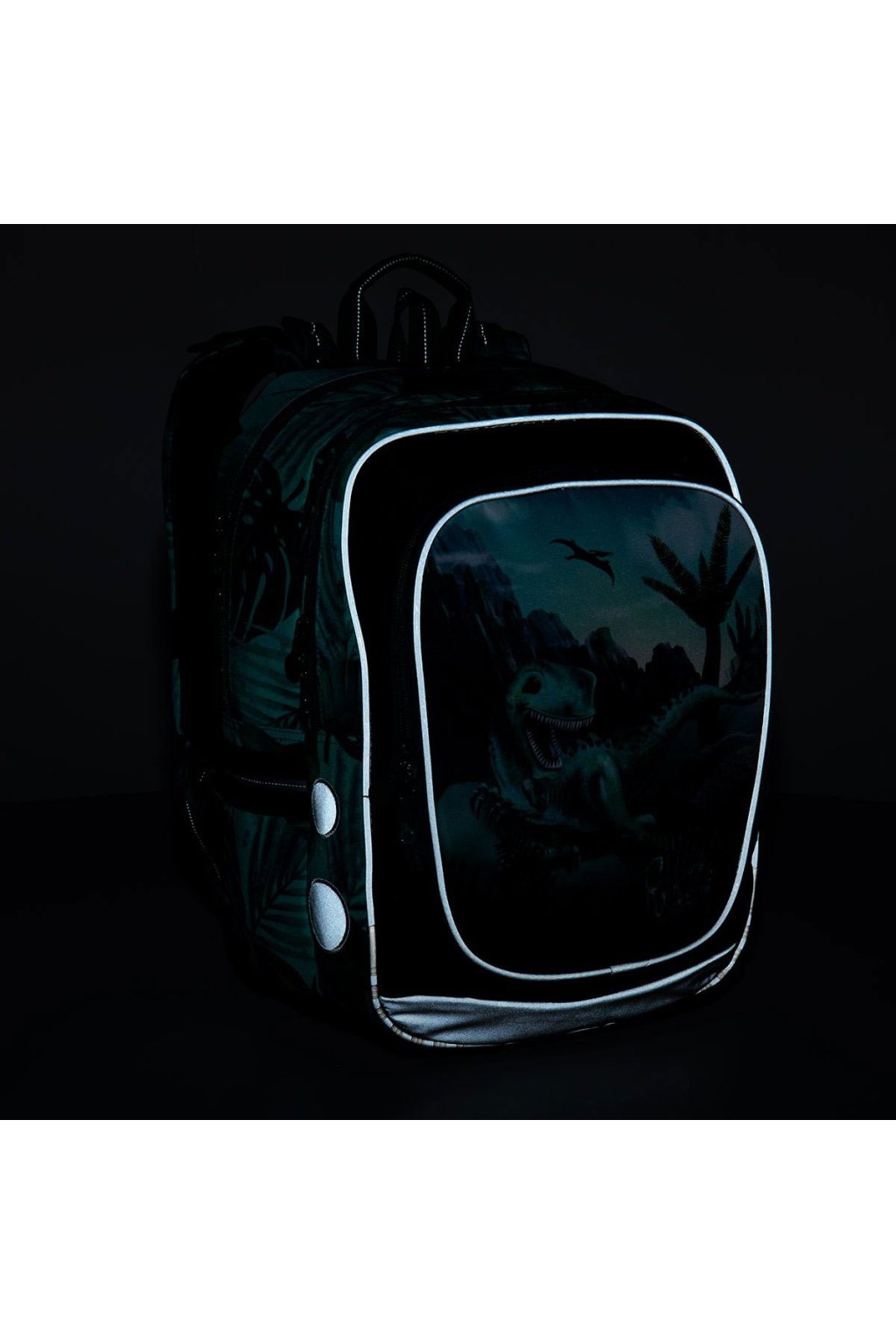 Certifikovaný školní batoh ENDY 20045 B pro KLUKY z kolekce značky TOPGAL, s velkým množstvím reflexních prvků, má design s obrázkem dinosaura na předním díle, pevná ergonomicky tvarovaná záda, polstrované popruhy, hrudní pásek, karabinku na klíče a boční síťovou kapsou na láhev.