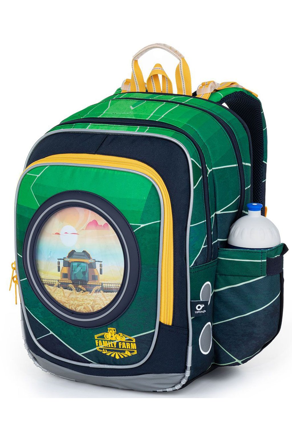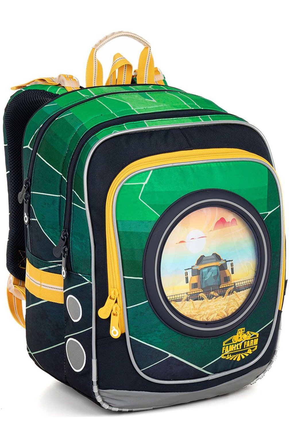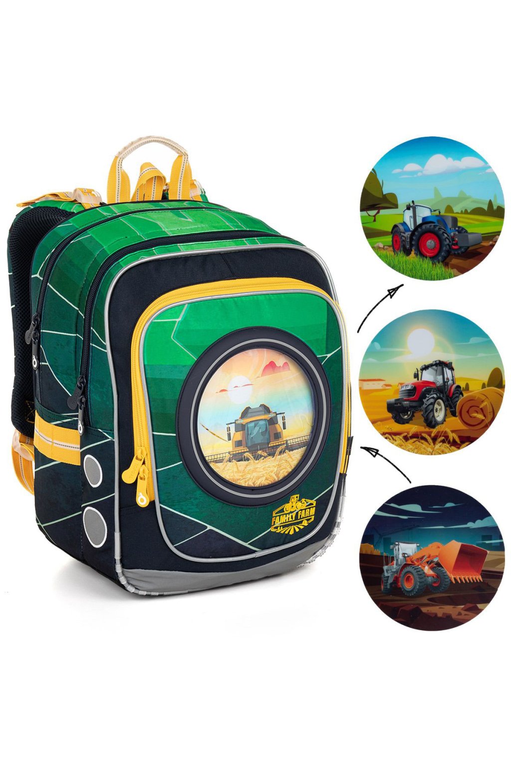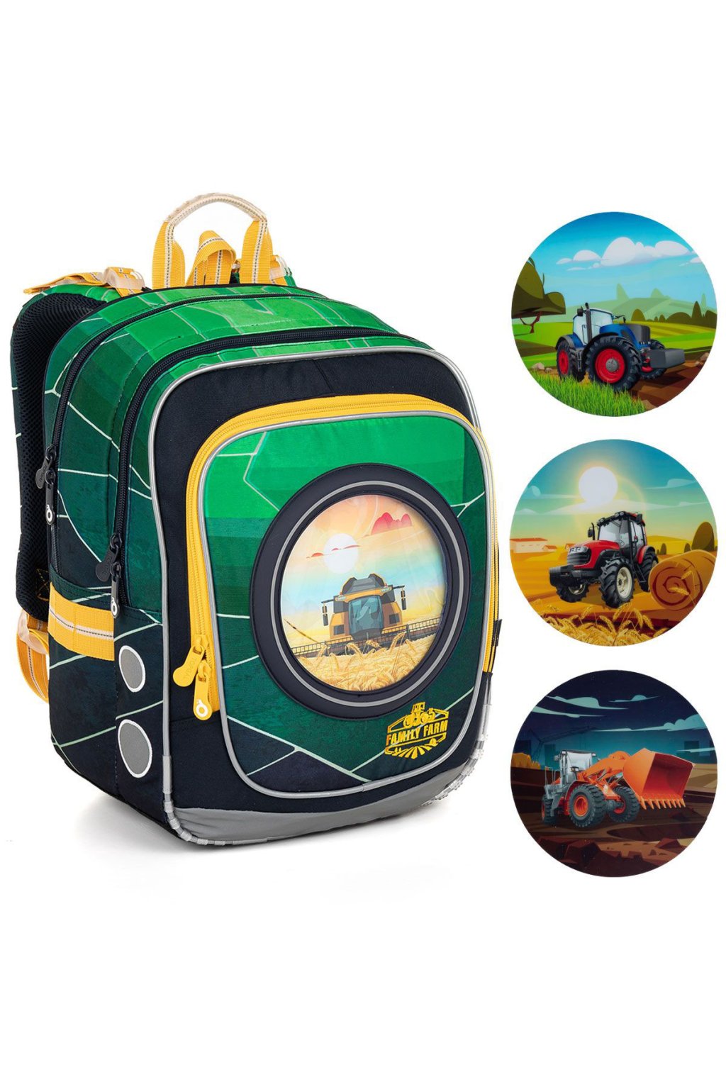 - dvoukomorový střih školního batohu Topgal pro kluky na 1 stupeň se zcela novým motivem a vyměnitelnými obrázky traktoru na předním díle