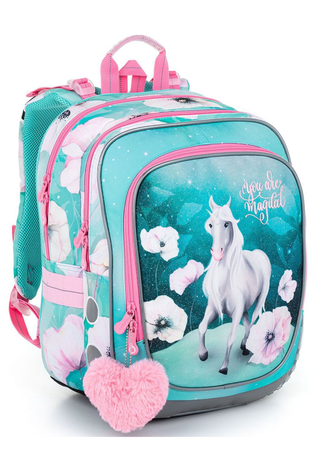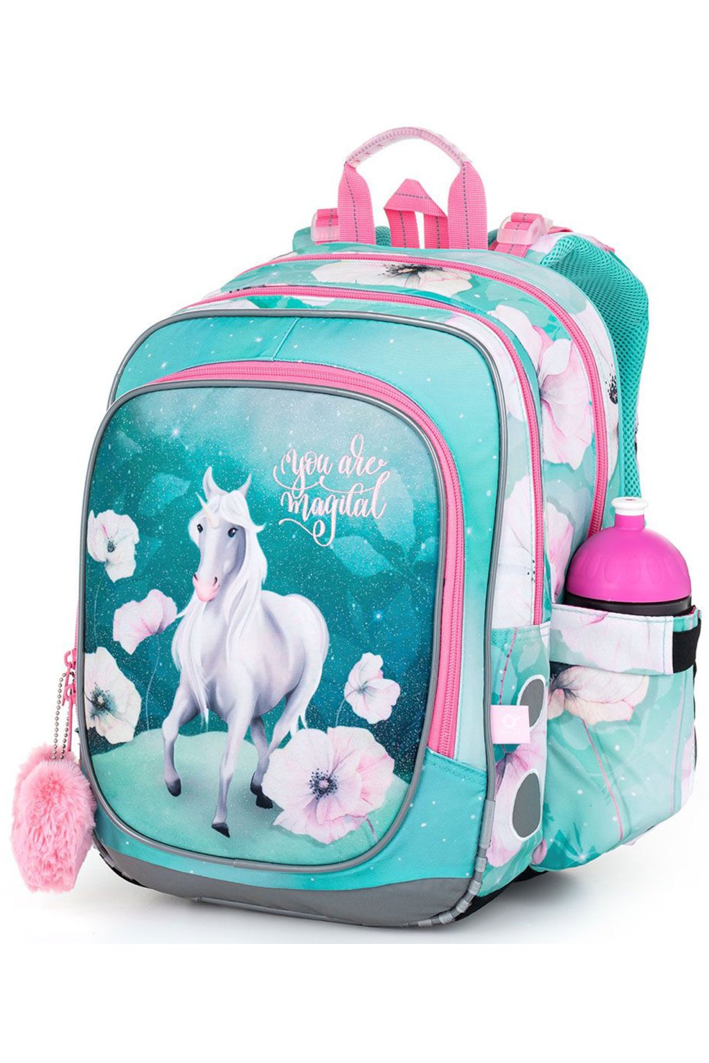 - dvoukomorový střih dívčího školního batohu Topgal pro 1 stupeň se zcela novým motivem jednorožec