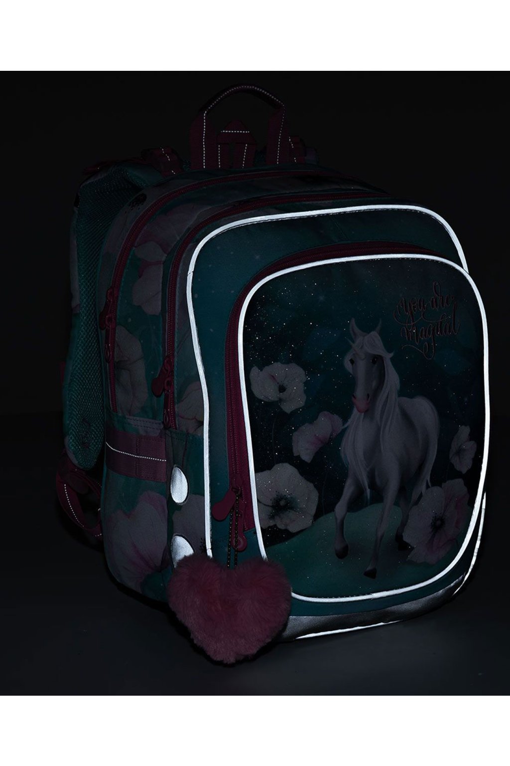 Certifikovaný školní batoh S JEDNOROŽCEM ENDY 22053-G pro HOLKY z nové kolekce 2024 značky TOPGAL s velkým množstvím reflexních prvků má nadčasový design s motivem koní na předním díle, pevná ergonomicky tvarovaná záda, polstrované popruhy, hrudní pásek, karabinku na klíče a boční síťovou kapsou na láhev.