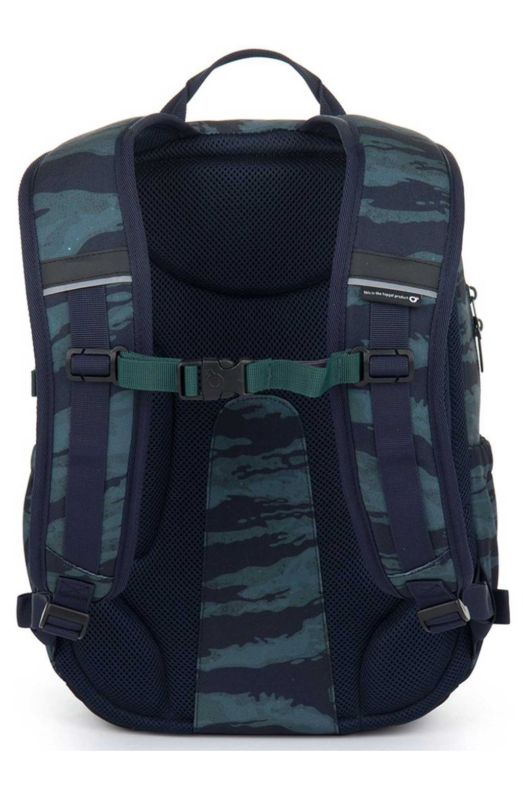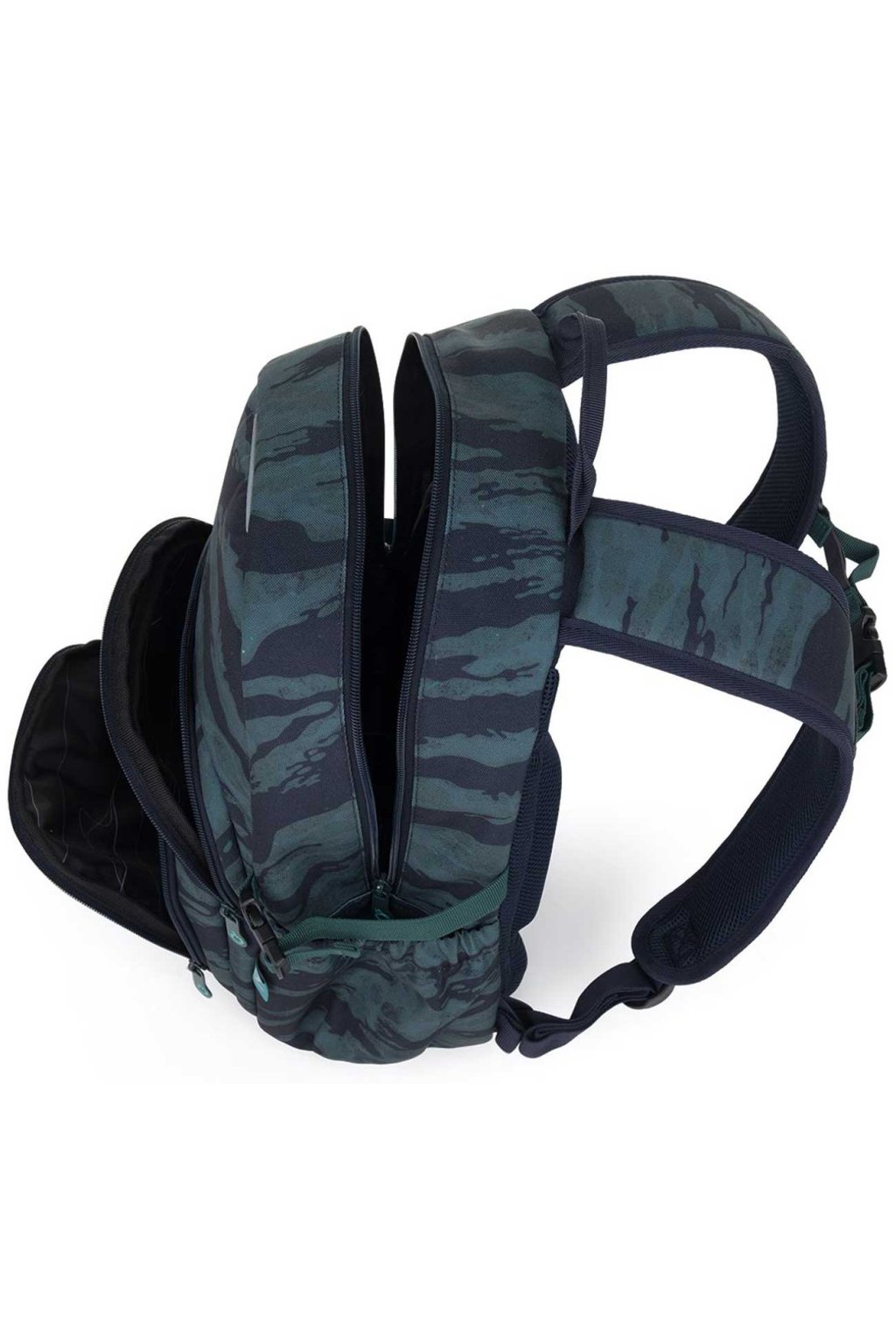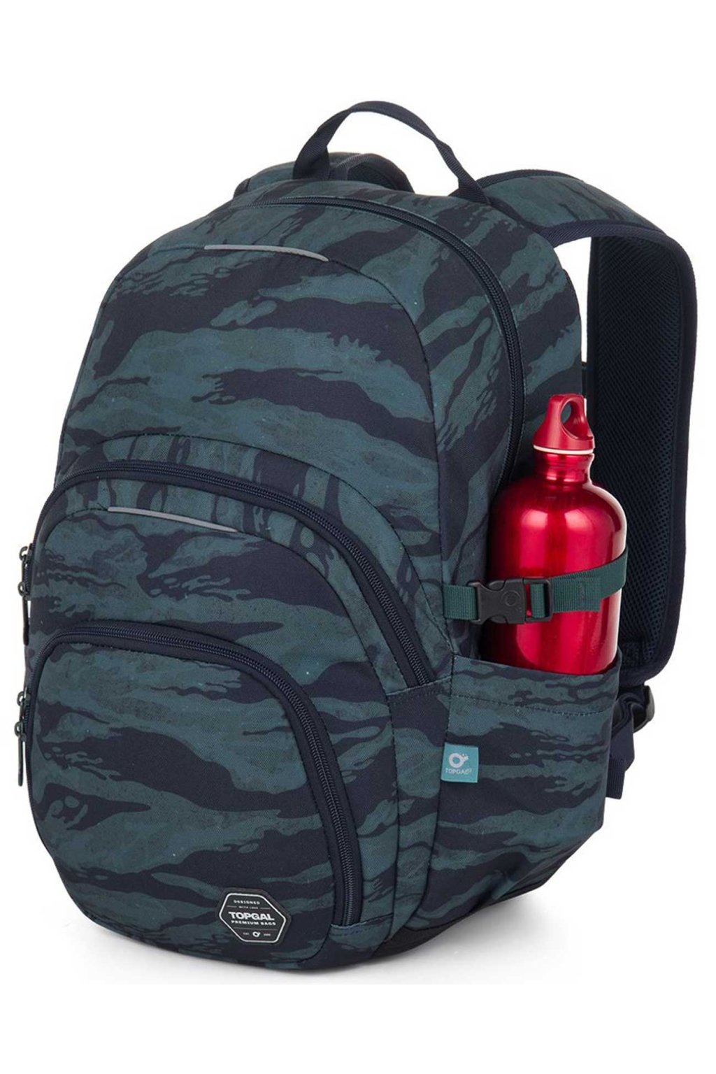 Jednokomorový batoh s maskáčovým vzorem a stylovou nášivkou. Záda batohu jsou polstrovaná, anatomicky tvarovaná s lehkou hliníkovou výztuhou. Uvnitř komory je umístěna polstrovaná kapsa na notebook, klíčenka a síťovaná kapsa na zip. Studentské batohy této firmy se těší stále větší oblíbenosti mezi školáky ZŠ i studenty SŠ. Studentský batoh má uvnitř celkem dvě samostatné zipem uzavíratelné kapsy z nich jedna obsahuje navíc polstrovanou kapsu na notebook 15". Pevná záda batohu i ramenní popruhy jsou anatomicky tvarované a s použitím hrudního pásku sedí výborně na zádech každého studenta. Každou boční část batohu tvoří nejen dostatečně velká kapsička na 1l láhev, ale také kompresní popruh pro fixaci větší láhve popř. k nastavení hloubky batohu. Dno studentského batohu je vyrobeno z pevného oděru odolného materiálu.