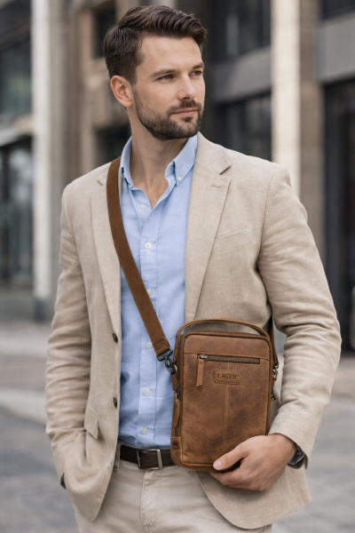 ELEGANTNÍ PÁNSKÁ TAŠKA přes rameno tzv. ,,crossbody taška" v hnědé barvě z kolekce značky LAGEN je vyrobena z kvalitní hovězí kůže. Kožená pánská taška přes rameno je charakteristická svým stylem, elegancí, nadčasovostí, ale především svou praktičností. Díky nastavitelnému popruhu můžete tuto pánskou tašku nosit nejen přes rameno, ale také ležérně křížem přes tělo, což vám umožní absolutní volnost pohybu a zároveň zaručuje, že vše potřebné budete mít ihned k dispozici. O přehlednost a pořádek se uvnitř pánské tašky přes rameno postarají dvě samostatné přihrádky, do kterých lze lehce umístit propisky, razítka, mobil, peněženku i doklady. Na zadním díle této kožené pánské tašky přes rameno je pak kapsička na klíče uzavíratelná na zip.