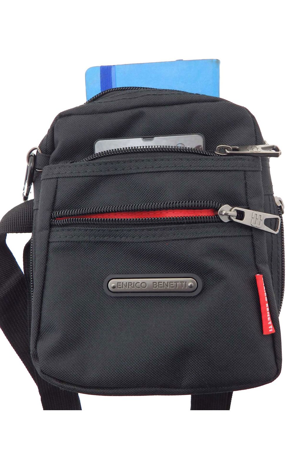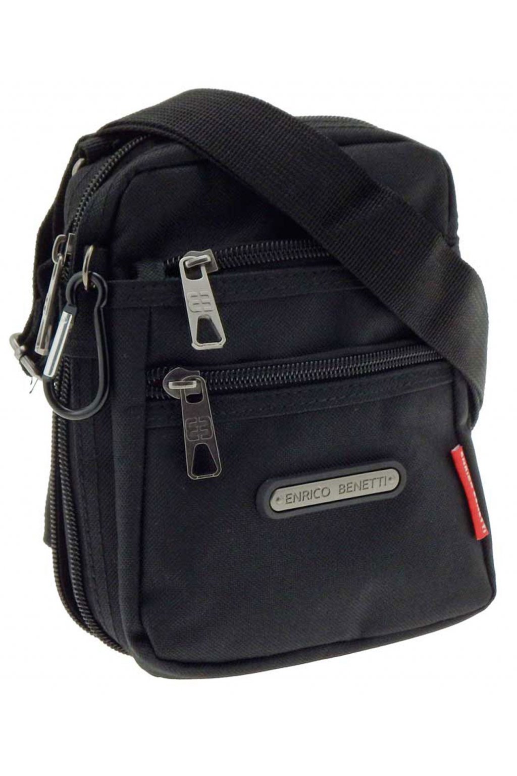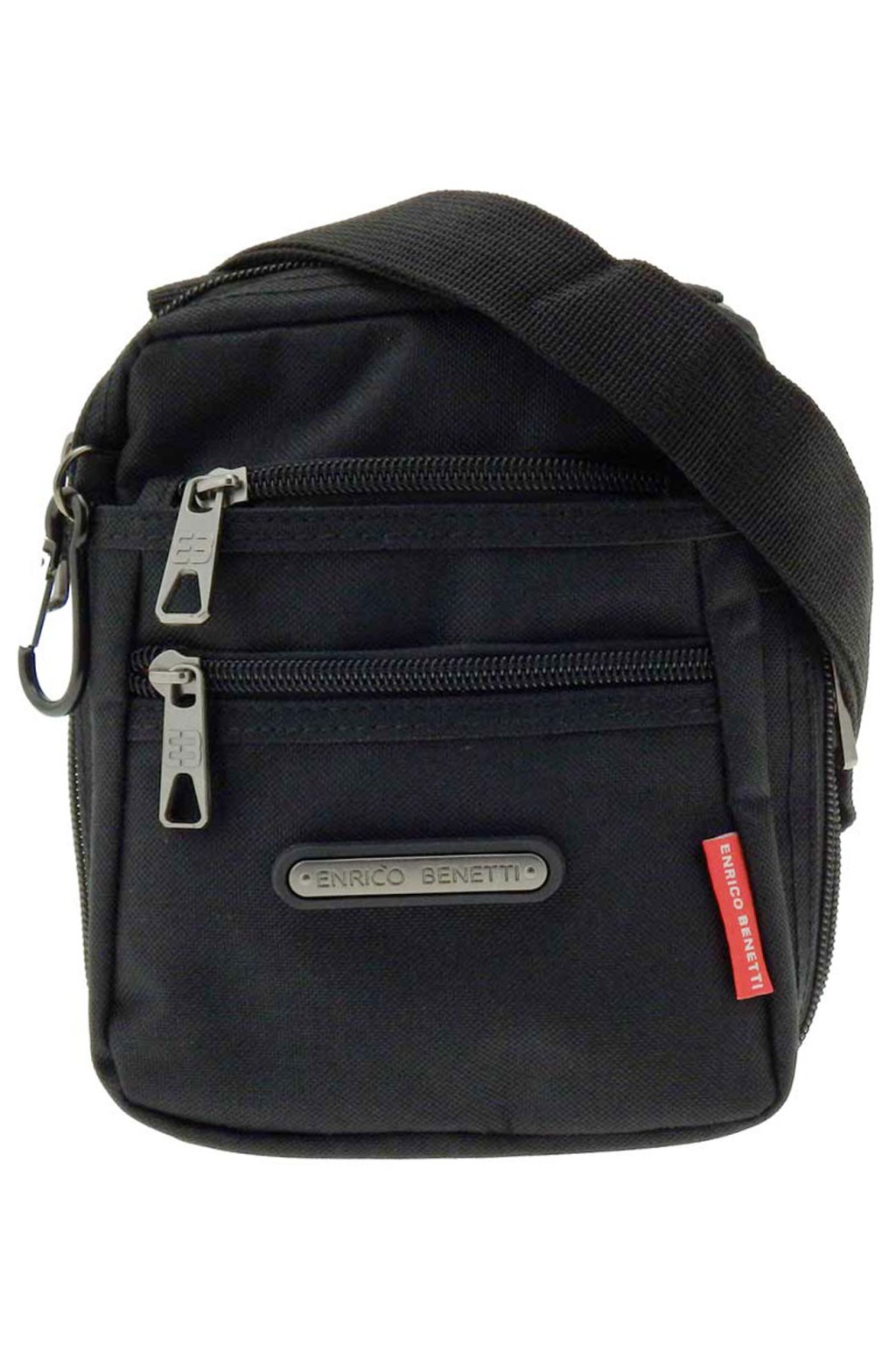Sportovní pánská taška přes rameno ze sportovní kolekce značky ENRICO BENETTI v černé barvě vyrobená z odolné textilie , kapsou uzavíratelnou zipem a nastavitelným popruhem k nošení přes rameno i křížem přes tělo. Vnitřní část pánské tašky tvoří dostatečně velká kapsa na peněženku, klíče a jiné drobnosti denní potřeby, kapsička na doklady uzavíratelná na zip a kapsička na mobil. Na přední části je kapsička také uzavíratelná na zip.